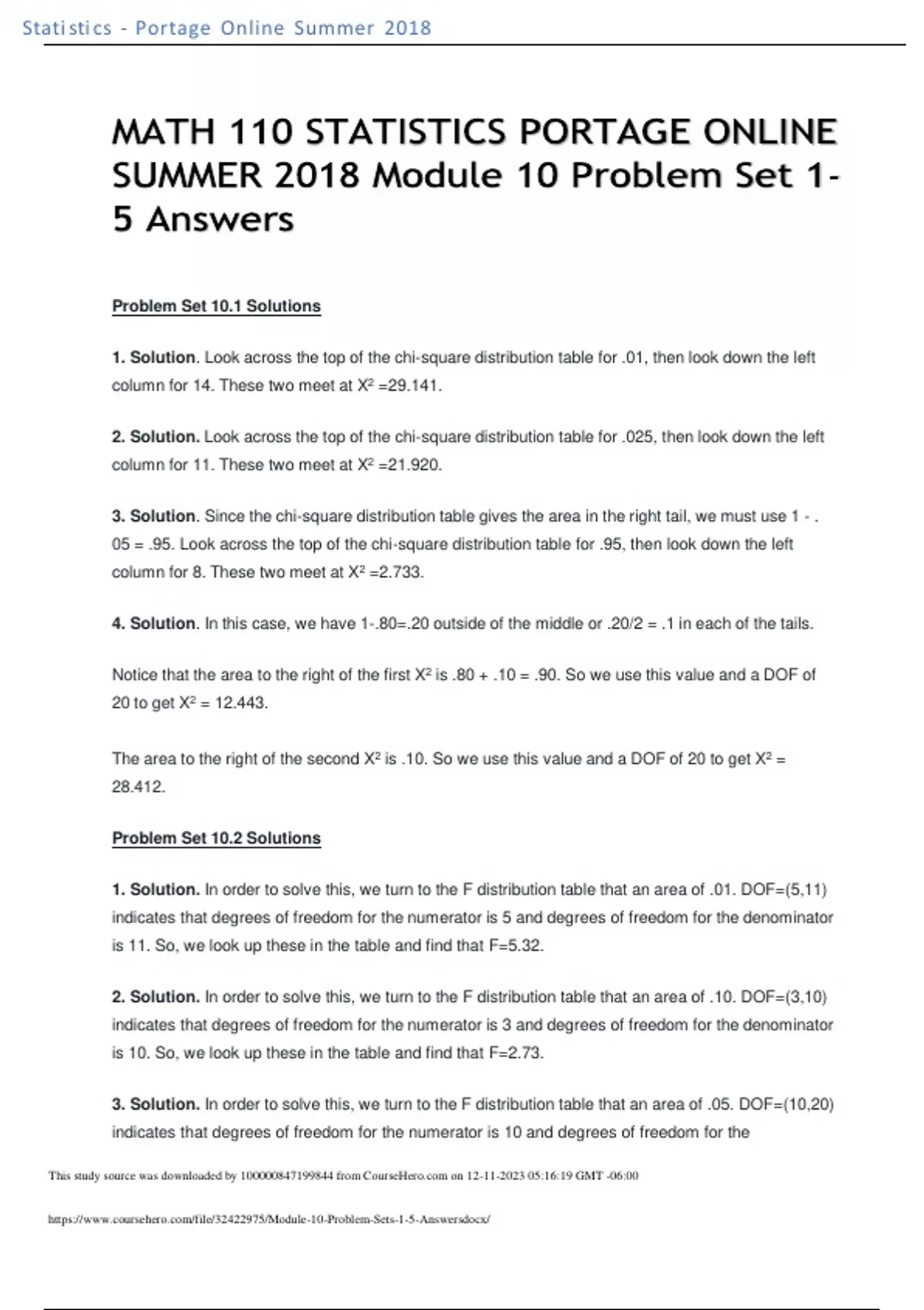 MATH 110 STATISTICS PORTAGE ONLINE SUMMER 2018 Module 10 Problem Set 1-5 Answers