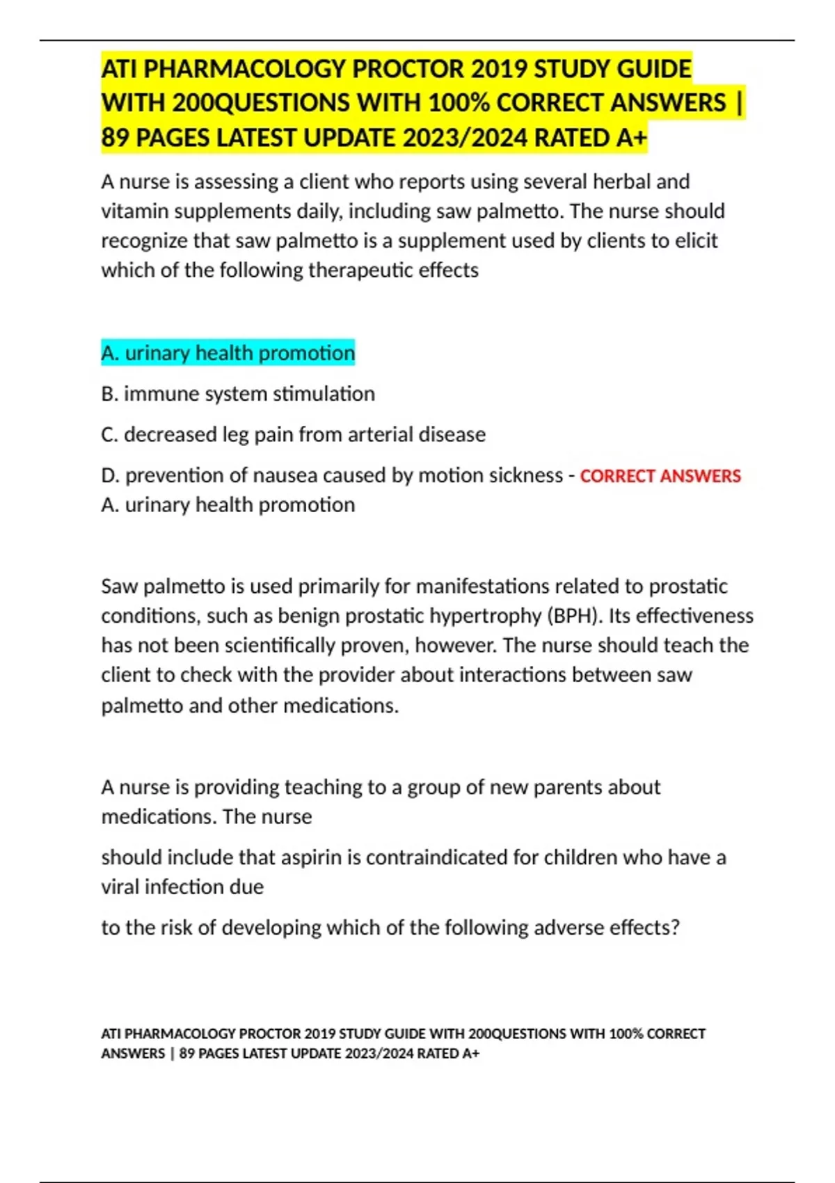 ATI PHARMACOLOGY PROCTOR 2019 STUDY GUIDE WITH 200QUESTIONS WITH 100% CORRECT ANSWERS | 89 PAGES LATEST UPDATE 2023/2024 RATED A+