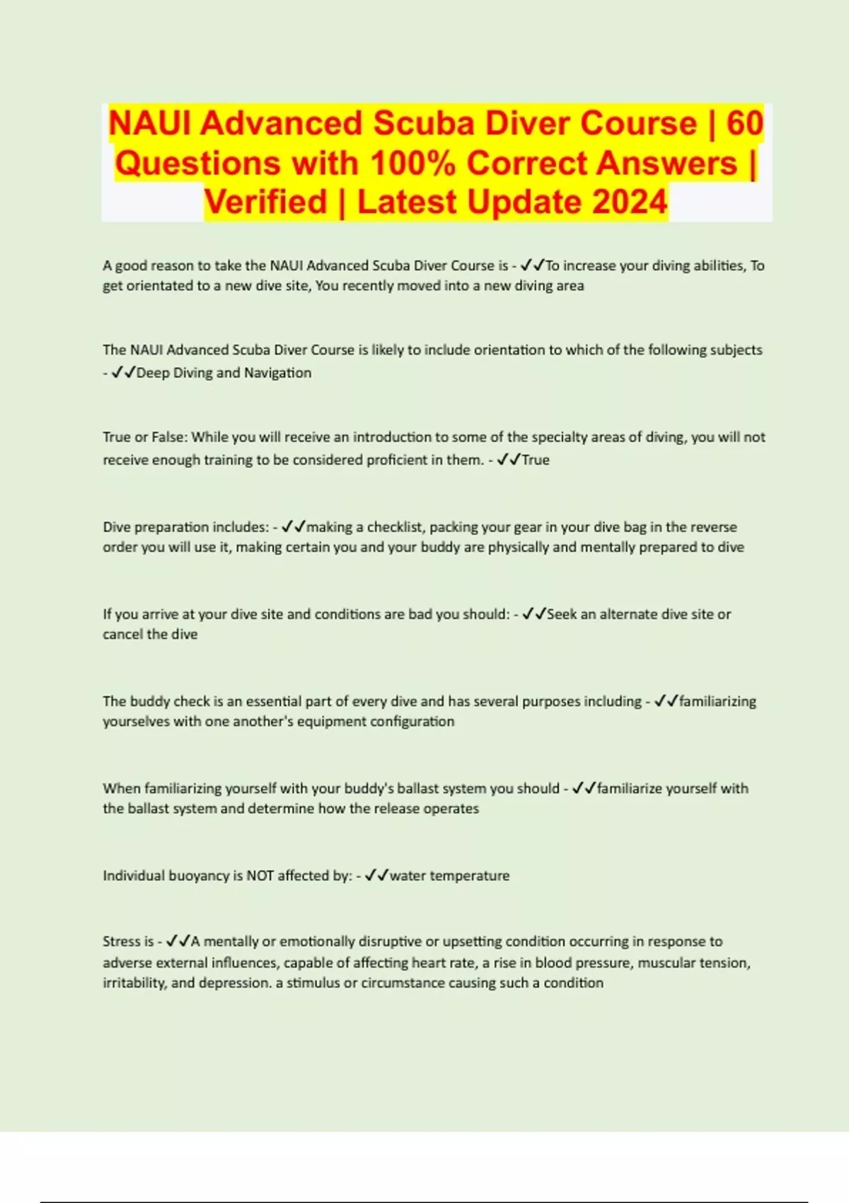 NAUI Advanced Scuba Diver Course | 60 Questions with 100% Correct Answers | Verified | Latest Update 2024
