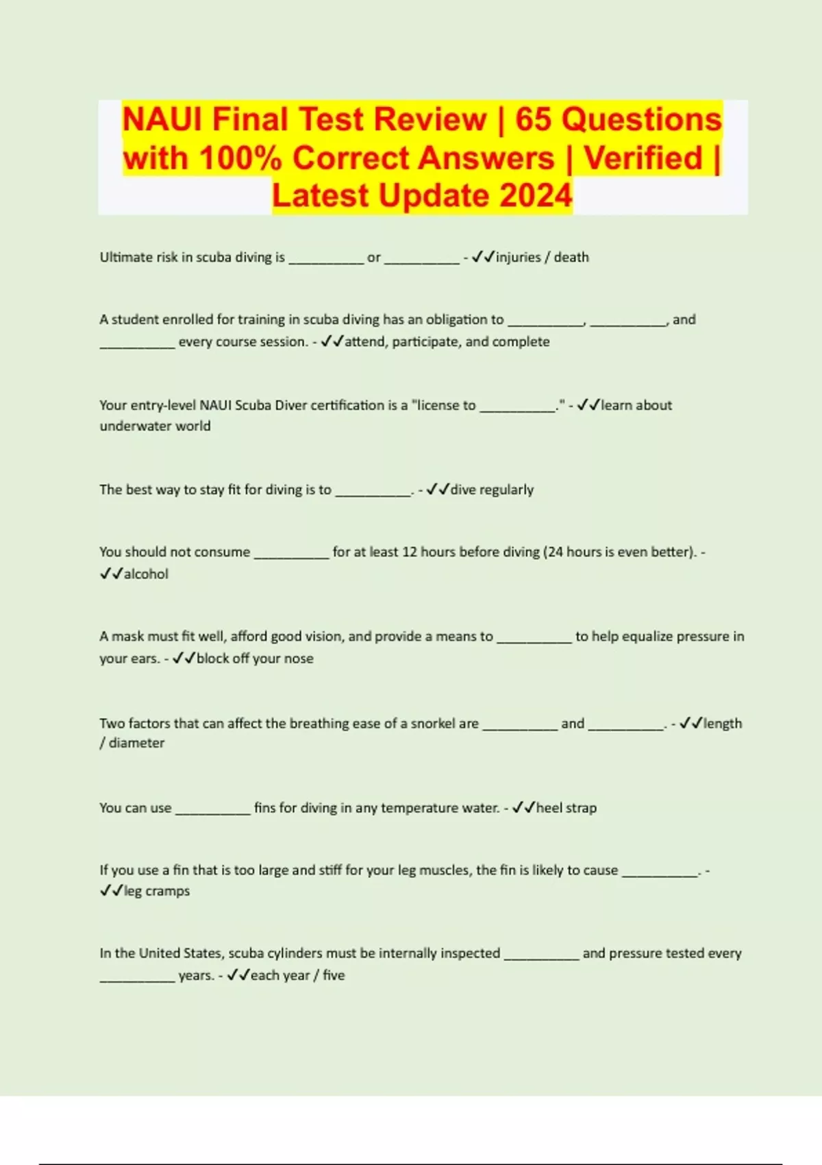 NAUI Final Test Review | 65 Questions with 100% Correct Answers | Verified | Latest Update 2024