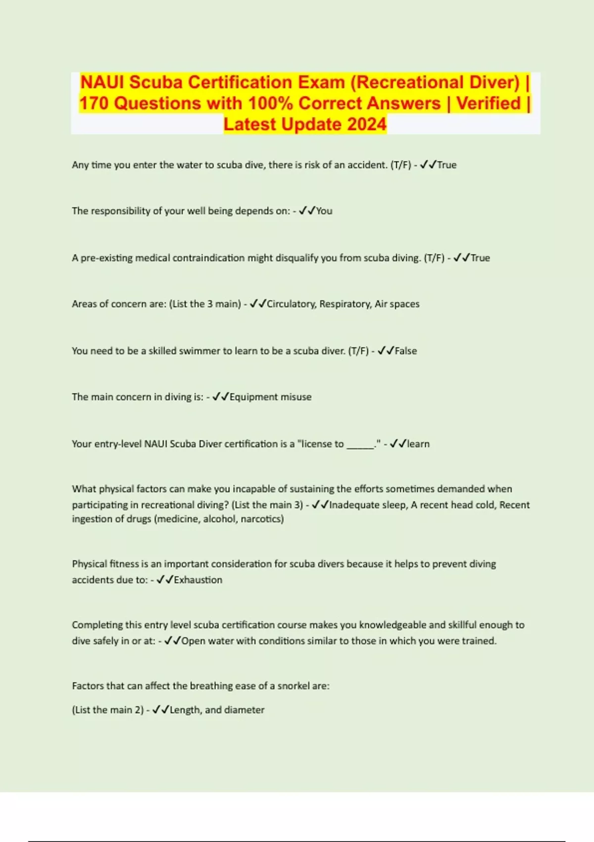 NAUI Scuba Certification Exam (Recreational Diver) | 170 Questions with 100% Correct Answers | Verified | Latest Update 2024