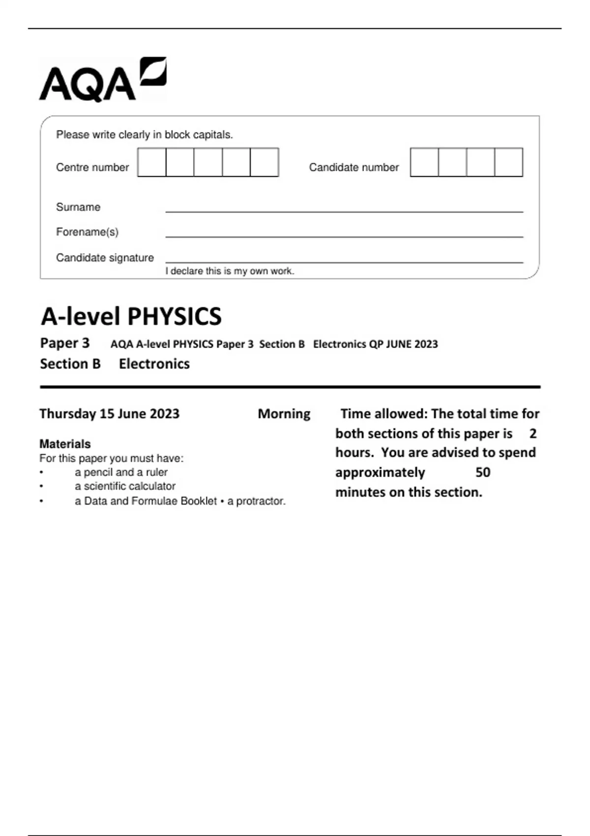AQA A-level PHYSICS Paper 3 Section B Electronics QP JUNE 2023