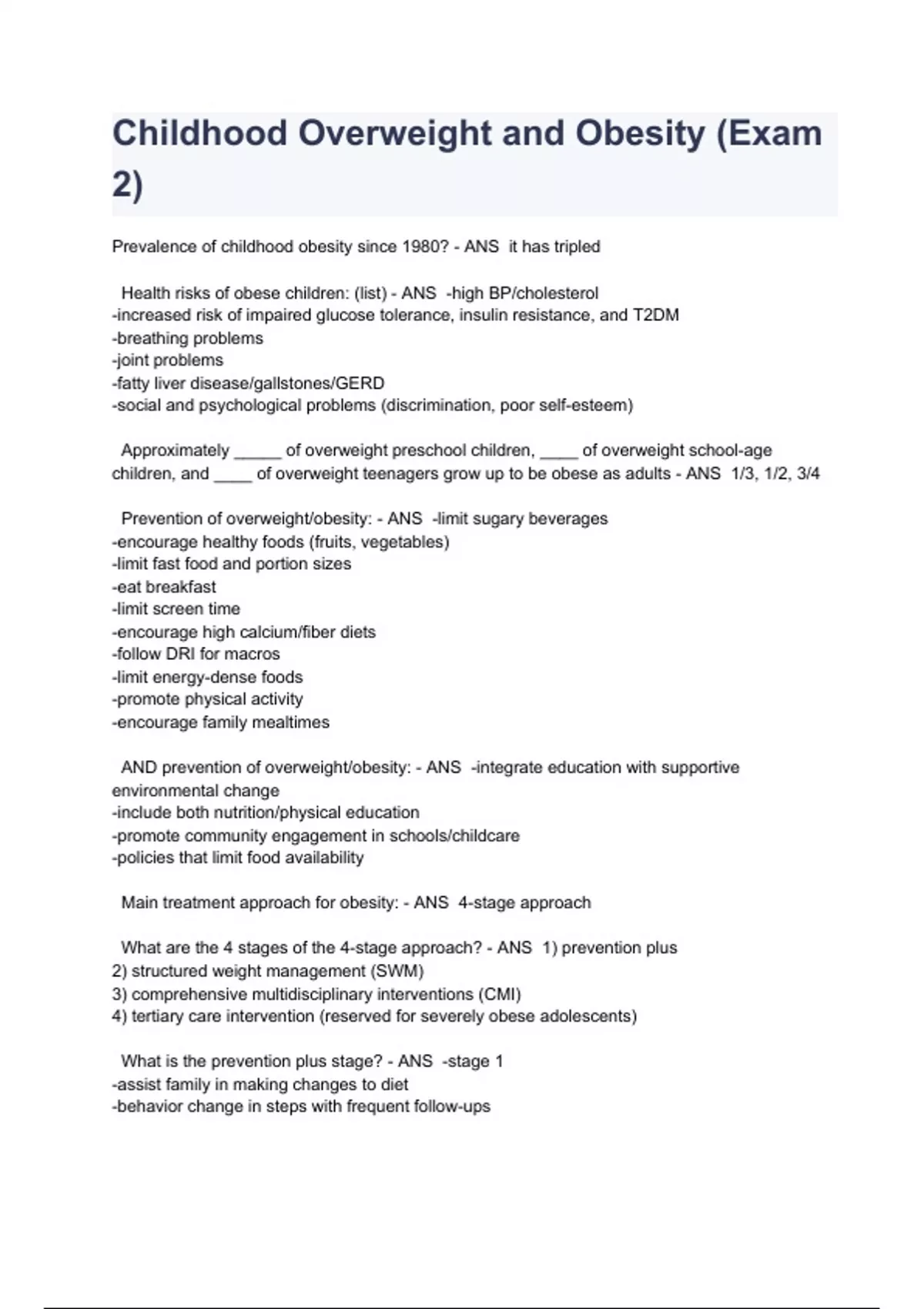 Childhood Overweight and Obesity (Exam 2) Prevalence of childhood obesity since 1980? - ANS it has tripled Health risks of obese children: (list) - ANS -high BP/cholesterol -increased risk of impaired glucose tolerance, insulin resistance, and T2DM -breathing problems -joint problems -fatty liver disease/gallstones/GERD -social and psychological problems (discrimination, poor self-esteem) Approximately _____ of overweight preschool children, ____ of overweight school-age children, and ____ of overweight teenagers grow up to be obese as adults - ANS 1/3, 1/2, 3/4 Prevention of overweight/obesity: - ANS -limit sugary beverages -encourage healthy foods (fruits, vegetables) -limit fast food and portion sizes -eat breakfast -limit screen time -encourage high calcium/fiber diets -follow DRI for macros -limit energy-dense foods -promote physical activity -encourage family mealtimes AND prevention of overweight/obesity: - ANS -integrate education with supportive environmental change -include both nutrition/physical education -promote community engagement in schools/childcare -policies that limit food availability Main treatment approach for obesity: - ANS 4-stage approach What are the 4 stages of the 4-stage approach? - ANS 1) prevention plus 2) structured weight management (SWM) 3) comprehensive multidisciplinary interventions (CMI) 4) tertiary care intervention (reserved for severely obese adolescents) What is the prevention plus stage? - ANS -stage 1 -assist family in making changes to diet -behavior change in steps with frequent follow-ups