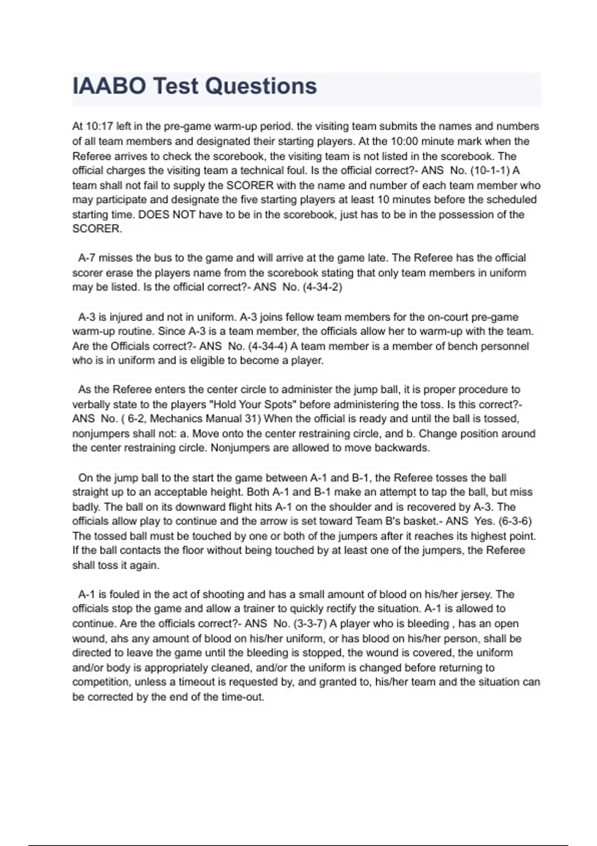 IAABO Test Questions At 10:17 left in the pre-game warm-up period. the visiting team submits the names and numbers of all team members and designated their starting players. At the 10:00 minute mark when the Referee arrives to check the scorebook, the visiting team is not listed in the scorebook. The official charges the visiting team a technical foul. Is the official correct?- ANS No. (10-1-1) A team shall not fail to supply the SCORER with the name and number of each team member who may participate and designate the five starting players at least 10 minutes before the scheduled starting time. DOES NOT have to be in the scorebook, just has to be in the possession of the SCORER. A-7 misses the bus to the game and will arrive at the game late. The Referee has the official scorer erase the players name from the scorebook stating that only team members in uniform may be listed. Is the official correct?- ANS No. (4-34-2) A-3 is injured and not in uniform. A-3 joins fellow team members for the on-court pre-game warm-up routine. Since A-3 is a team member, the officials allow her to warm-up with the team. Are the Officials correct?- ANS No. (4-34-4) A team member is a member of bench personnel who is in uniform and is eligible to become a player. As the Referee enters the center circle to administer the jump ball, it is proper procedure to verbally state to the players "Hold Your Spots" before administering the toss. Is this correct?- ANS No. ( 6-2, Mechanics Manual 31) When the official is ready and until the ball is tossed, nonjumpers shall not: a. Move onto the center restraining circle, and b. Change position around the center restraining circle. Nonjumpers are allowed to move backwards. On the jump ball to the start the game between A-1 and B-1, the Referee tosses the ball straight up to an acceptable height. Both A-1 and B-1 make an attempt to tap the ball, but miss badly. The ball on its downward flight hits A-1 on the shoulder and is recovered by A-3. The officials allow play to continue and the arrow is set toward Team B's basket.- ANS Yes. (6-3-6) The tossed ball must be touched by one or both of the jumpers after it reaches its highest point. If the ball contacts the floor without being touched by at least one of the jumpers, the Referee shall toss it again. A-1 is fouled in the act of shooting and has a small amount of blood on his/her jersey. The officials stop the game and allow a trainer to quickly rectify the situation. A-1 is allowed to continue. Are the officials correct?- ANS No. (3-3-7) A player who is bleeding , has an open wound, ahs any amount of blood on his/her uniform, or has blood on his/her person, shall be directed to leave the game until the bleeding is stopped, the wound is covered, the uniform and/or body is appropriately cleaned, and/or the uniform is changed before returning to competition, unless a timeout is requested by, and granted to, his/her team and the situation can be corrected by the end of the time-out. A-1, while dribbling in the backcourt throws a pass to the frontcourt. While standing in A's frontcourt, B-2 deflects the ball back into the backcourt where A-1 catches the ball in the air. The official rules this a legal play. Is the official correct?- ANS Yes. (9-9-1) A player shall not be the first to touch a ball after it has been in team control in the frontcourt, if he/she or a teammate last touched or was touched by the ball in the frontcourt before it went into the backcourt. While A-1 is dribbling the ball from backcourt to frontcourt, he/she has forward foot and ball in the frontcourt while back foot remains in the backcourt. The official continues the ten second count. Is the official correct?- ANS Yes. (4-1) A ball which is in contact with a player or with the court is in the backcourt if either the ball or player is touching the backcourt. A-2 catches a throw-in pass while straddling the division line. A-2 lifts the foot form the backcourt and starts a dribble. The thrown ball hits the division line and returns and hits A-2's hand. The official rules this a legal play.- ANS No. (9) During a throw-in by A-1 near the division line, A-2 catches the ball with the left foot on the floor in the front court. A-2 then steps in the backcourt with the right foot. Official rules this a backcourt violation. Is the official correct?- ANS Yes. (9-9) Team control is established in A's frontcourt when A-2 catches the throw-in pass. A-1 dives and recovers the ball on the playing court. Momentum causes A-1 to roll with the ball several feet. The official rules this a traveling violation. Is this correct?- ANS No. (4-44) A-1 jumps to shoot, seeing the shot will blocked he/she drops the ball to the floor to start a dribble. A-1 is the first to touch the ball upon returning to the court. The official rules this a traveling violation. Is the official correct?- ANS Yes. (4-44-3c) The pivot foot may not be lifted before the ball is released, to start a dribble. Team A entitled to a throw-in after a timeout is still huddling when the second horn sounds. The official places the ball on the court and starts the 5 second count. B-1 rushes over and picks up the ball and attempts to make a throw-in. The official rules this a delay of game technical foul. Is the official correct?- ANS No. (4-47-1) Warning for delay for a throw-in plane violation. (9-2-10) The opponent(s) of the thrower shall not have any part of his/her person through the inbounds side of the throw-in boundary line plane until the ball is released on a throw-in pass. A-1 seeing the ball is going out of bounds jumps and while airborne recovers the ball and throws it back onto the playing court. A-1 after being out of bounds returns to the court, recovers the ball and starts a dribble. The official should rule this a?- ANS Double Dribble A-1 receives a throw-in pass from A-2. A-1 fumbles the ball to the court. The official rules this a start of a dribble. Is the official correct?- ANS No. (4-15, 4-21) D