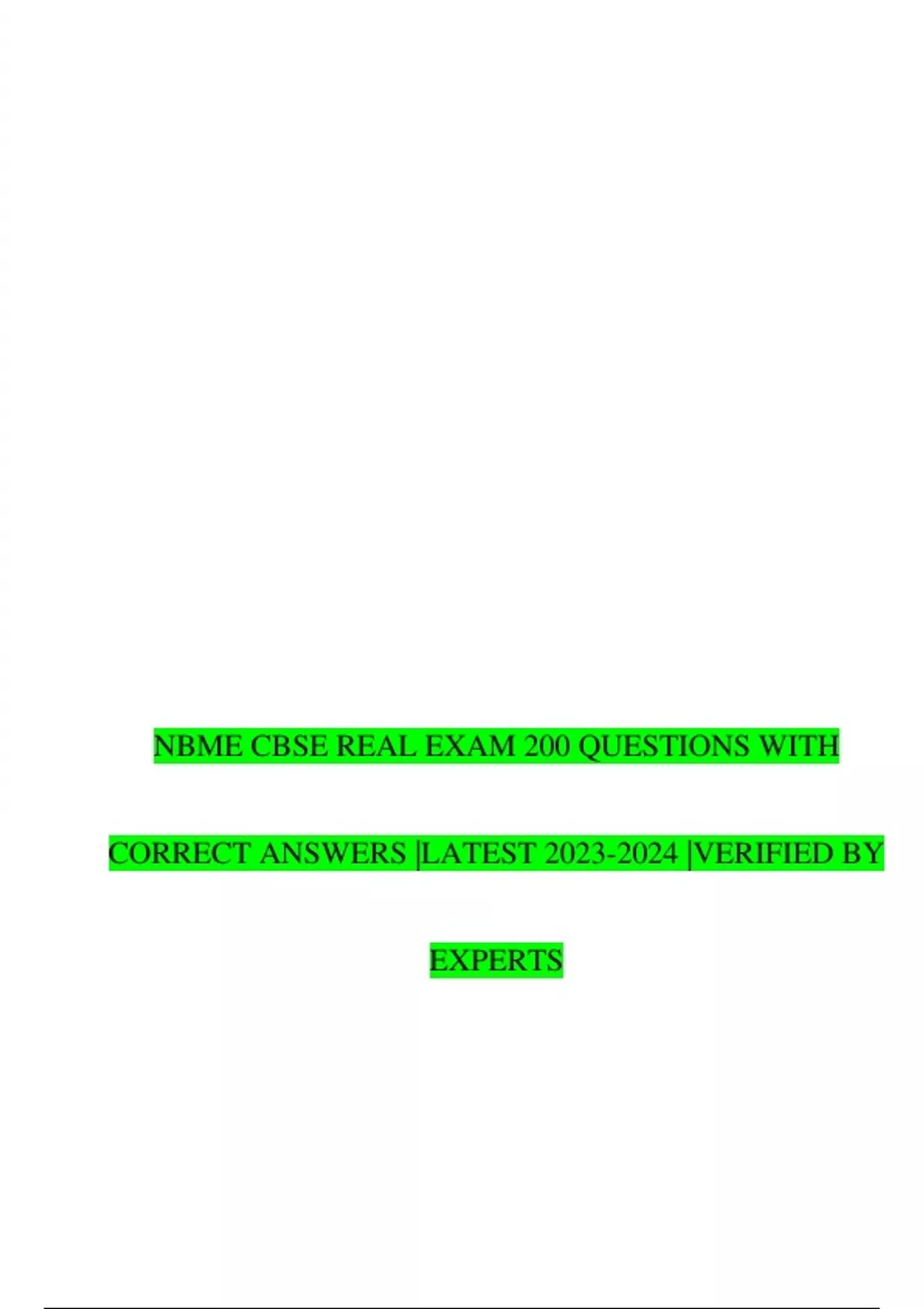 NBME CBSE EXAM with 200 Questions and Answers 70yo M dies in a motor vehicle collision. Was undergoing evaluation for occult blood in the stool. Photo of transverse colon shown. Dx? - ANSWER- Tubular adenoma 38yo M with 1-week hx of watery, itchy eyes and a runny nose. Physical shows inflamed nasal mucosa. No congestion in lower lung. Pharmacotherapy? - ANSWER- Loratadine 16yo girl with 3-day hx of fever, nonproductive cough, and fatigue. T 38.3, P 88/min, BP 102-70. PE shows pale conjunctivae. CXR shows bilateral interstitial infiltrates. Blood spontaenously agglutinates while awaiting transport to the laboratory. Antibody isotypes causing agglutination? - ANSWER- IgM 24yo M with small tender blisters on his penis 3 days after unprotected sex. Photograph shown. Causal agent? - ANSWER- HSV-2 42yo F with 3-year hx of an intermittent facial rash, including the forehead, eyelids, nose, and cheeks. Rash seems to be getting worse since she moved from New York to Florida last year. Spicy foods 3 precipitate a flushing reaction that seems to exacerbate the rash. PE shows erythema over the nose and cheeks, with scattered telangiectasias and a few papules. Dx? - ANSWER- Rosacea 53yo M returned from Africa, has fever, headache, and abdominal discomfort. Received appropriate vaccinations prior to the trip. T 39.4C. A wright-stained peripheral smear shown. Dx? - ANSWERMalaria 68yo F with T2DM and hypertension that has been poorly controlled despite hydrochlorothiazide treatment. BP 150/96, Labs show serum glucose concentration of 130 and proteinuria. In addition to current Rx, which is most appropriate pharmacotherapy? - ANSWER- Lisinopril 66yo M with stage IV colon cancer with 3-day hx of severe diarrhea after receiving chemotherapy with fluorouracil, leucovorin, and Irinotecan. prescribed opioid antidiarrheal agent with no CNS effects. Which med? - ANSWER- Loperamide 35yo M in ED with 2-hour hx of sever fatigue and dizziness. Had profuse, watery diarrhea for 8 hours despite a lack of oral intake. Recently returned from a medical relief trip to a remove village in Honduras. T 36.7 C, P 122/min, BP 90/50. PE shows dry skin and decreased capillary refill. Stool for occult blood is negative; stool is gray and turbid. Gram stain shows gram-negative, comma-shaped bacteria; no erythrocytes of leukocytes. MOA of toxin? - ANSWER- Activation of adenylyl cyclase 59yo F with gradual onset of lack of muscle control in her left arm and leg. Sx 1 mo ago after dx with metastatic breast cancer. PE shows ataxia of left upper and lower extremities. Muscle strength, DTR, sensation, proprioception normal. Metastatic tumor in which location? - ANSWER- cerebellum 4 Newborn delivered at 38 weeks' gestation weighs 1800 g. PE shows petechial rash, microcephaly, and hepatosplenomegaly. Serologic test for CMV: IgG + in mother, + in newborn; IGM - in mother, + in newborn. Explanation? - ANSWER- Congenital cytomegalovirus infection Female newborn is delivered at 38 weeks' gestation. Apgar 8 and 8 at 1/5 min. PE shows a bulging, fluod0filled mass approximately 5 cm in diameter in the midline over the lumbosacral region. No spontaneous movements of the lower extremities. Abnormality most likely occurred because of abnormal development during which periods of postconception (in days)? - ANSWER- 15 to 40 64yo M in ED 3 hours after SOB with exertion and extreme fatigue. Has ischemic heart disease. P 125/min, BP 105/60. ECG shows atrial fibrillation. Intravenous ibutilide is administered. Ten minutes later, ECG shows normal sinus rhythm. Risk for which drug effect in the next 6 hours? - ANSWER- torsades de pointes . . . . ..
