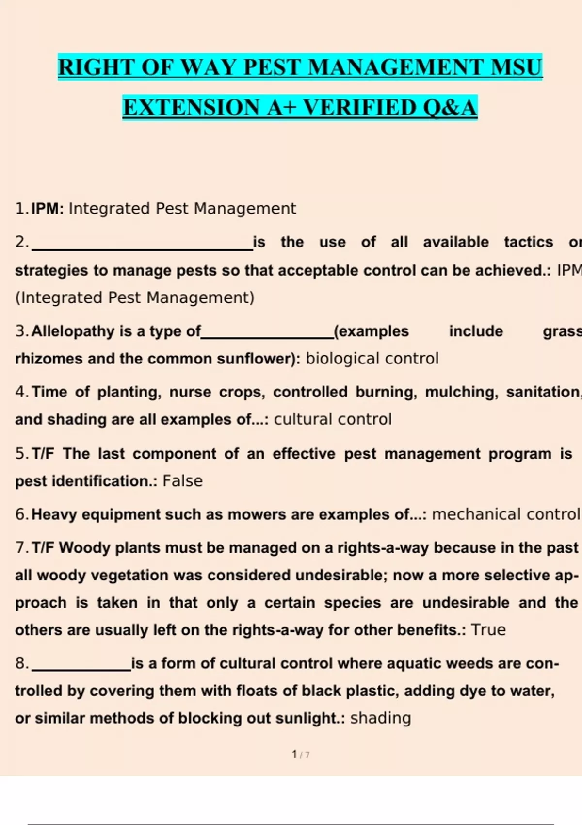 RIGHT OF WAY PEST MANAGEMENT MSU EXTENSION A+ VERIFIED QUESTIONS AND ANSWERS