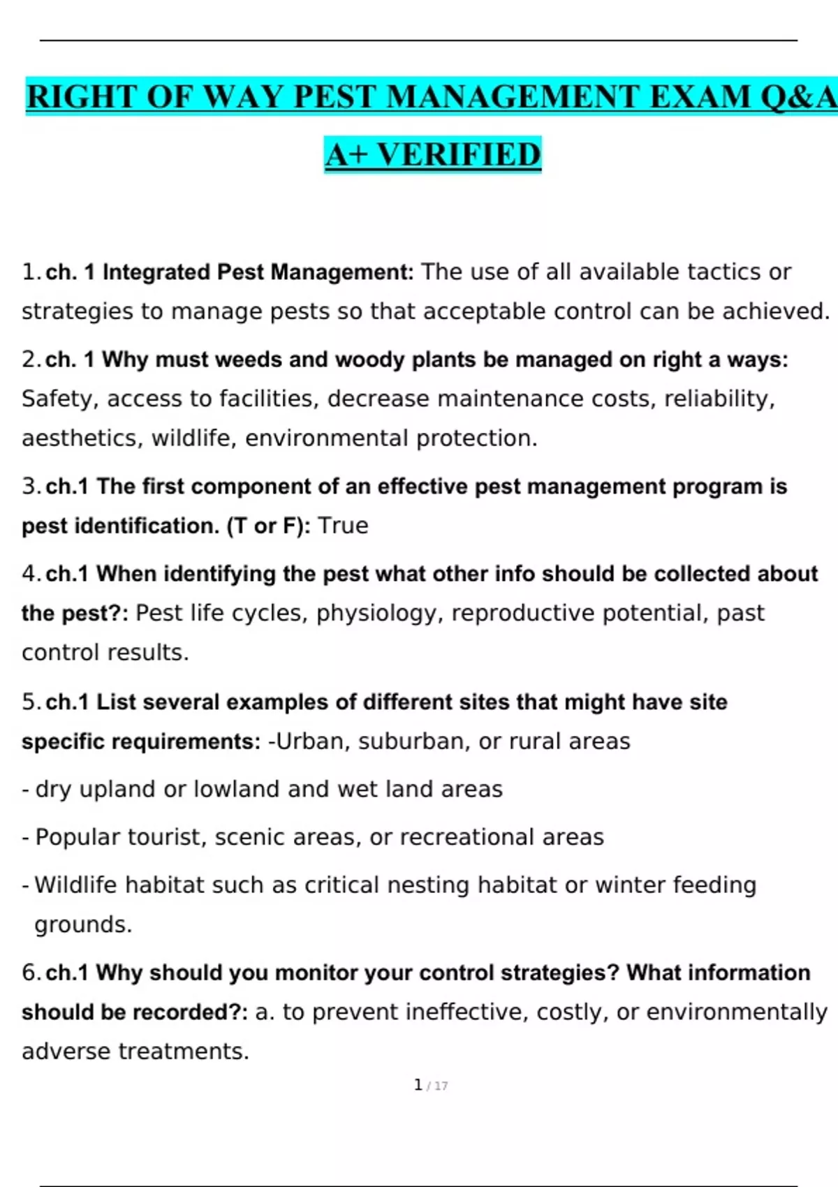 RIGHT OF WAY PEST MANAGEMENT EXAM QUESTIONS AND ANSWERS A+ VERIFIED