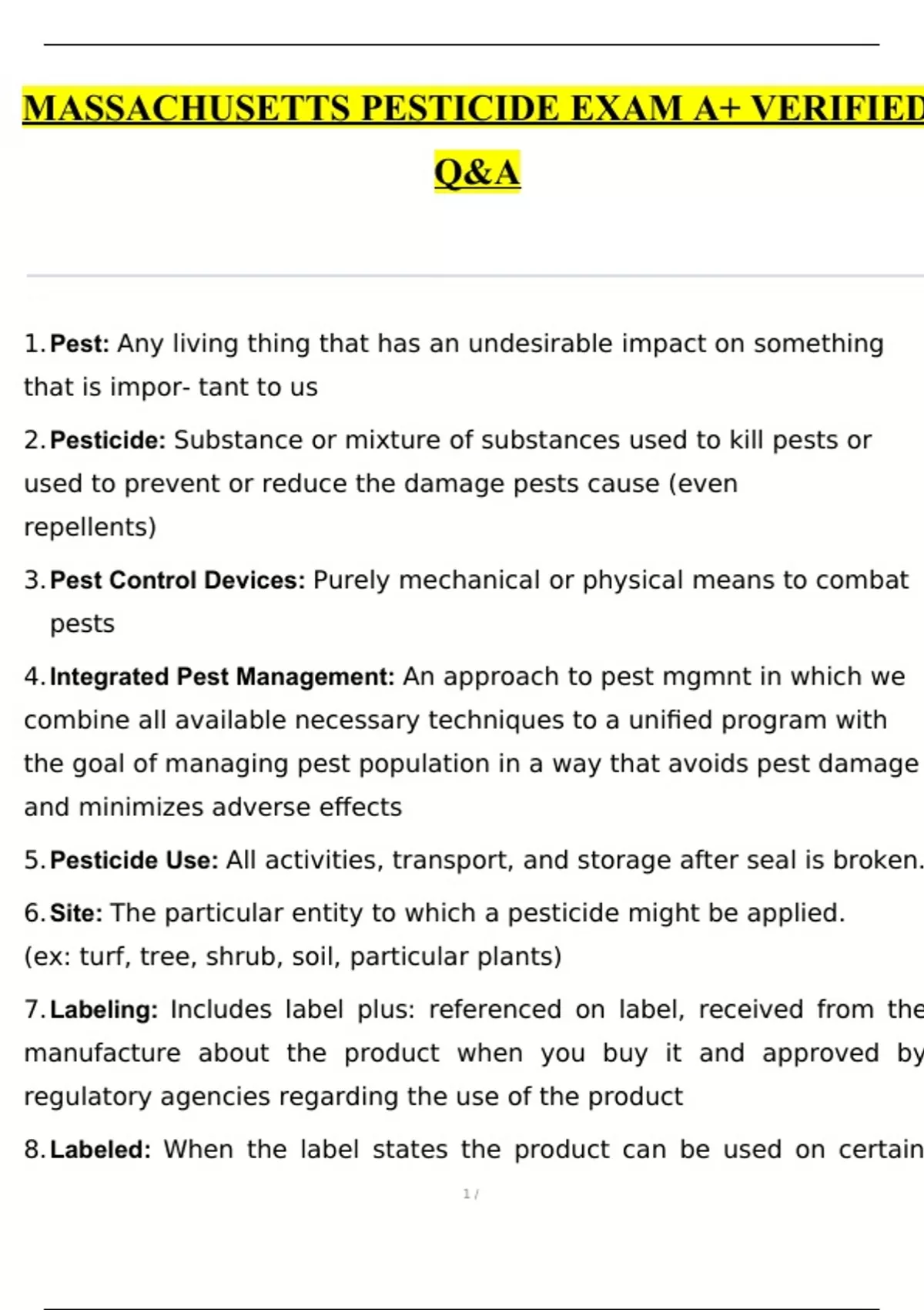 MASSACHUSETTS PESTICIDE EXAM A+ VERIFIED QUESTIONS AND ANSWERS