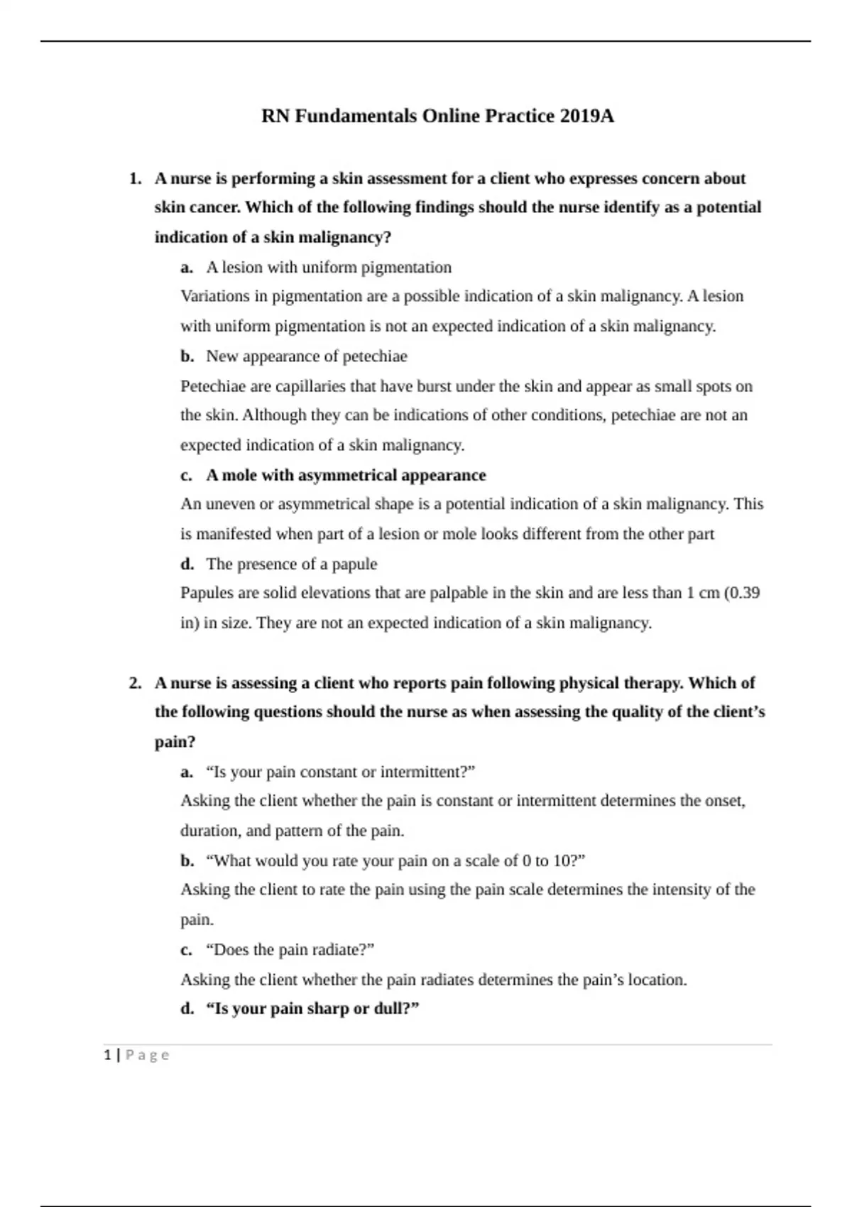 RN Fundamentals Online Practice 2019A 1. A nurse is performing a skin assessment for a client who expresses concern about skin cancer. Which of the following findings should the nurse identify as a potential indication of a skin malignancy? a. A lesion with uniform pigmentation Variations in pigmentation are a possible indication of a skin malignancy. A lesion with uniform pigmentation is not an expected indication of a skin malignancy. b. New appearance of petechiae Petechiae are capillaries that have burst under the skin and appear as small spots on the skin. Although they can be indications of other conditions, petechiae are not an expected indication of a skin malignancy. c. A mole with asymmetrical appearance An uneven or asymmetrical shape is a potential indication of a skin malignancy. This is manifested when part of a lesion or mole looks different from the other part d. The presence of a papule Papules are solid elevations that are palpable in the skin and are less than 1 cm (0.39 in) in size. They are not an expected indication of a skin malignancy. 2. A nurse is assessing a client who reports pain following physical therapy. Which of the following questions should the nurse as when assessing the quality of the client’s pain? a. “Is your pain constant or intermittent?” Asking the client whether the pain is constant or intermittent determines the onset, duration, and pattern of the pain. b. “What would you rate your pain on a scale of 0 to 10?” Asking the client to rate the pain using the pain scale determines the intensity of the pain. c. “Does the pain radiate?” Asking the client whether the pain radiates determines the pain’s location. d. “Is your pain sharp or dull?” 1 | P a g e Asking the client whether the pain is sharp or dull, crushing, throbbing, aching, burning, electric- like, or shooting helps determine the quality of the pain. 3. A nurse is admitting a new client. Which of the following actions should the nurse take while performing medication reconciliation? a. Verify the client’s name on their identification bracelet with the medication administration record. The nurse should verify the client’s name on their identification bracelet when administering medication; however, this action is not a part of performing medication reconciliation. b. Call the pharmacy to determine whether the client’s medications are available. The nurse should call the pharmacy if the client’s medications are not available to administer at the appropriate time; however this action is not a part of performing medication reconciliation c. Compare the client’s home medications with the provider’s prescriptions. The nurse should compare the client’s home medications with the provider’s prescriptions when performing medication reconciliation. d. Place the client’s home medication bottles in a secure location. The nurse should place the client's home medications in a secure location to ensure safe handling of prescribed medications; however, this action is not a part of performing medication reconciliation. 4. A nurse is auscultating the anterior chest of a client who was admitted to a medicalsurgical unit. Listen to the audio clip of what the nurse auscultates through the stethoscope and identify the type of breath sounds. (Click on the audio button to listen to the clip.) a. Crackles Unlike these breath sounds, crackles (also called rales) are discontinuous sounds heard primarily during inhalation and resulting from air bubbling through fluid or mucus in the airways. b. Rhonchi 2 |.........................