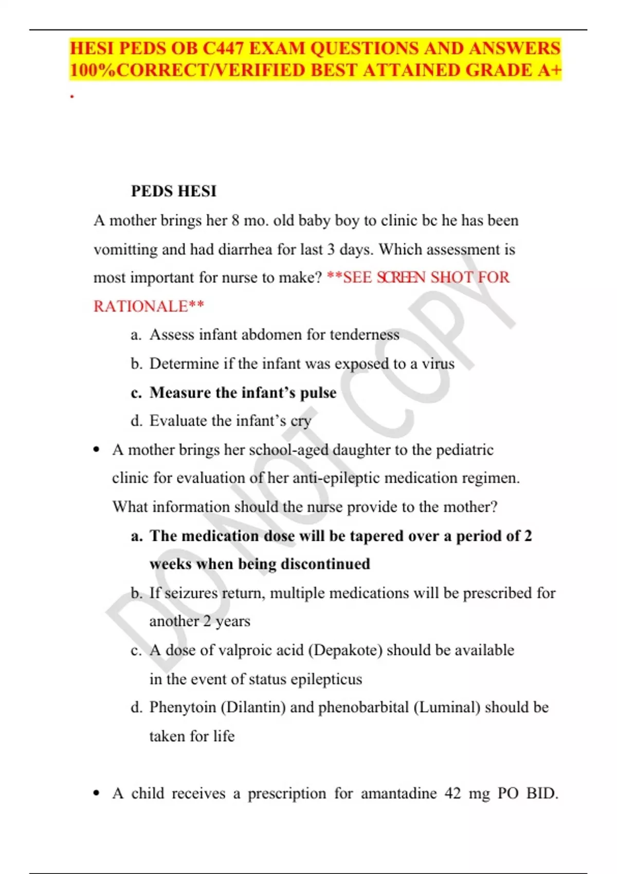 HESI PEDS OB C447 EXAM QUESTIONS AND ANSWERS 100%CORRECT/VERIFIED BEST ATTAINED GRADE A+ .