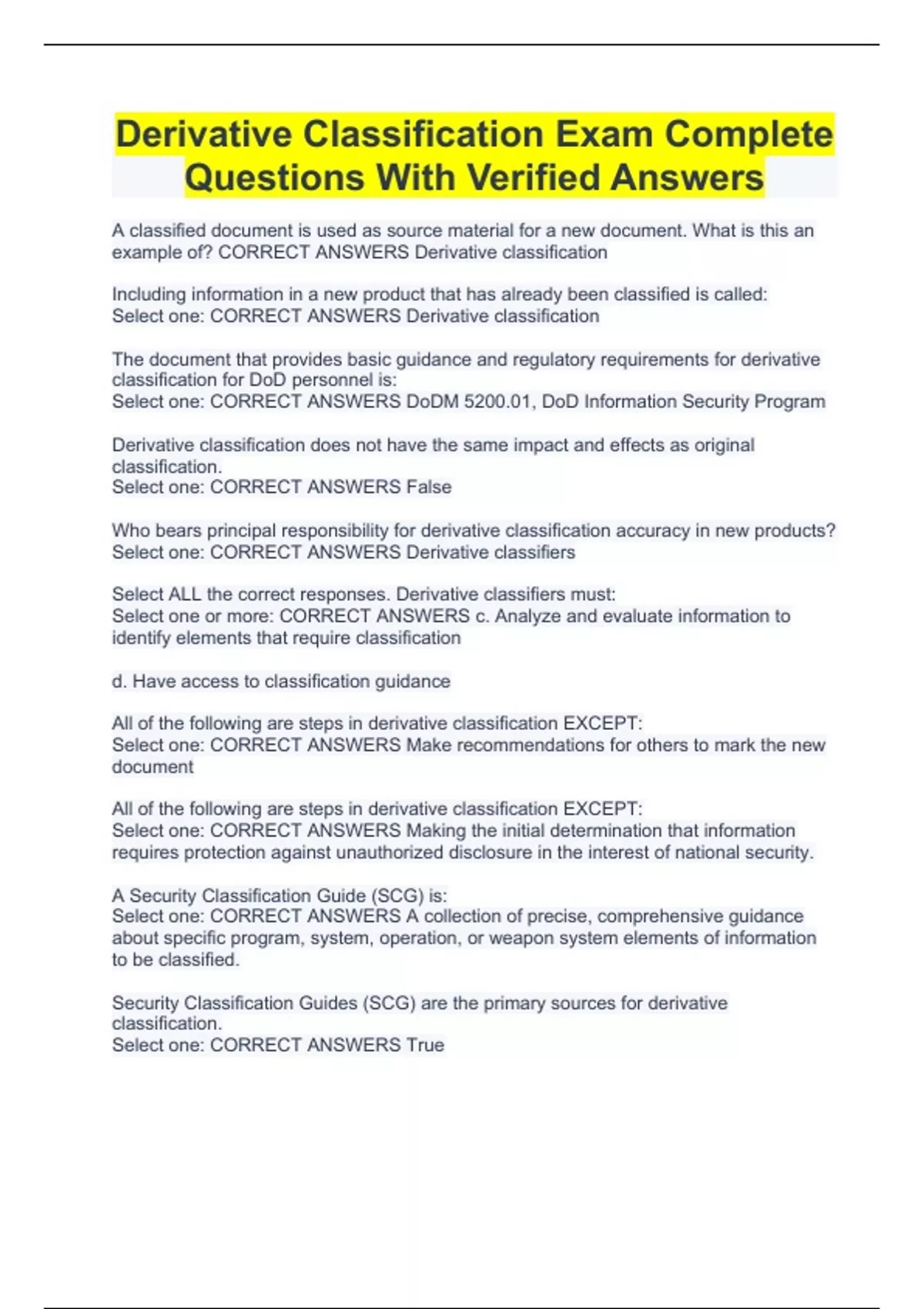 Derivative Classification Exam Complete Questions With Verified Answers