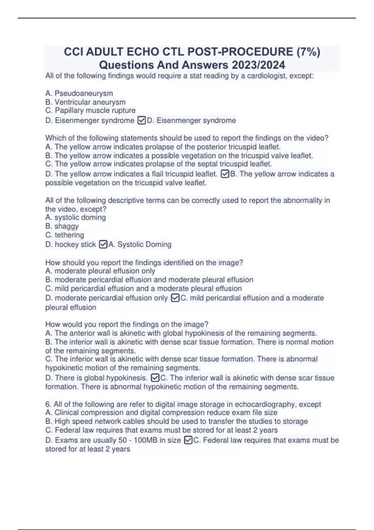 CCI ADULT ECHO CTL POST-PROCEDURE (7%) Questions And Answers 2023/2024