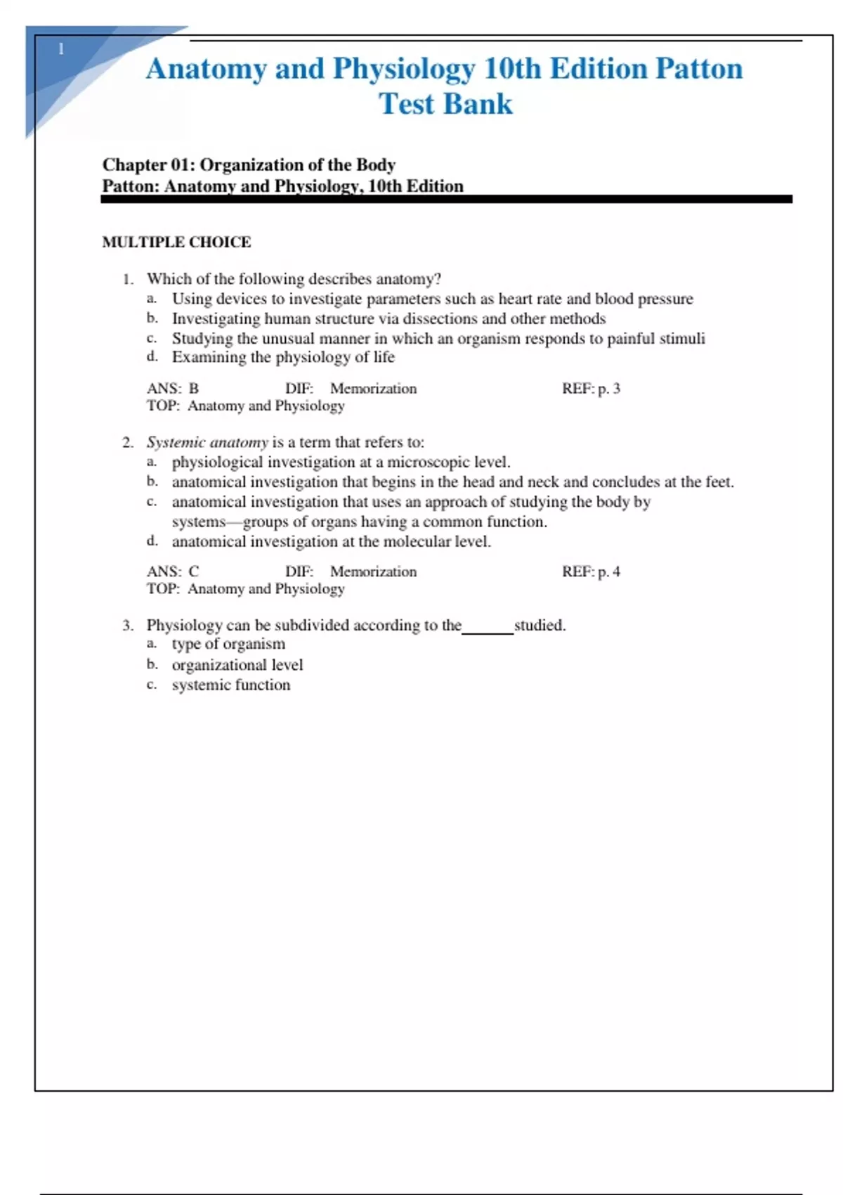 Anatomy and Physiology 10th Edition Patton Test Bank