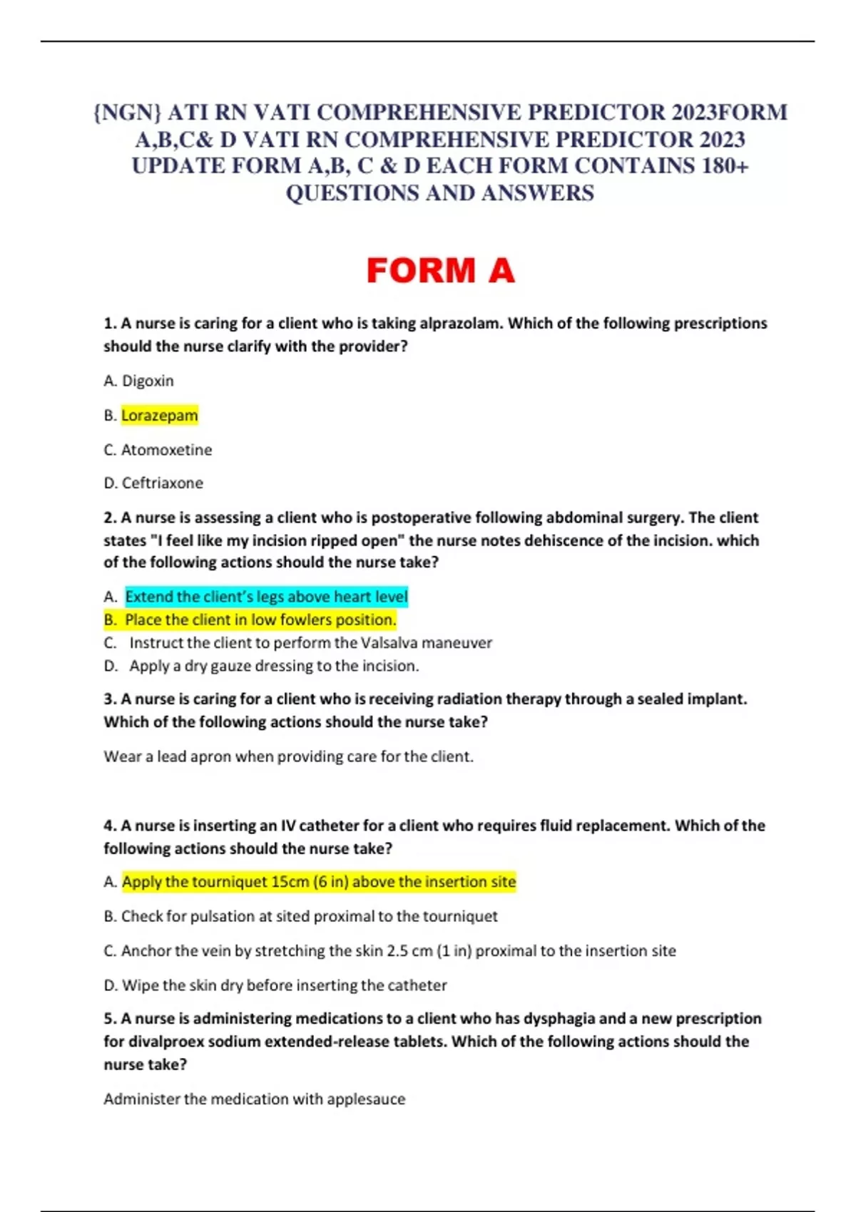 {NGN} ATI RN VATI COMPREHENSIVE PREDICTOR 2023FORM A,B,C& D VATI RN COMPREHENSIVE PREDICTOR 2023 UPDATE FORM A,B, C & D EACH FORM CONTAINS 180+ QUESTIONS AND ANSWERS FORM A 1. A nurse is caring for a client who is taking alprazolam. Which of the following prescriptions should the nurse clarify with the provider? A. Digoxin B. Lorazepam C. Atomoxetine D. Ceftriaxone 2. A nurse is assessing a client who is postoperative following abdominal surgery. The client states "I feel like my incision ripped open" the nurse notes dehiscence of the incision. which of the following actions should the nurse take? A. Extend the client’s legs above heart level B. Place the client in low fowlers position. C. Instruct the client to perform the Valsalva maneuver D. Apply a dry gauze dressing to the incision. 3. A nurse is caring for a client who isreceiving radiation therapy through a sealed implant. Which of the following actions should the nurse take? Wear a lead apron when providing care for the client. 4. A nurse isinserting an IV catheter for a client who requires fluid replacement. Which of the following actions should the nurse take? A. Apply the tourniquet 15cm (6 in) above the insertion site B. Check for pulsation atsited proximal to the tourniquet C. Anchor the vein by stretching the skin 2.5 cm (1 in) proximal to the insertion site D. Wipe the skin dry before inserting the catheter 5. A nurse is administering medicationsto a client who has dysphagia and a new prescription for divalproex sodium extended-release tablets. Which of the following actions should the nurse take? Administer the medication with applesauce 6. A nurse is completing a dietary assessment for a client who is Jewish and observes kosher dietary practices. Which of the following behaviors would the nurse expect to fine? A. Leavened bread maybe eaten during Passover