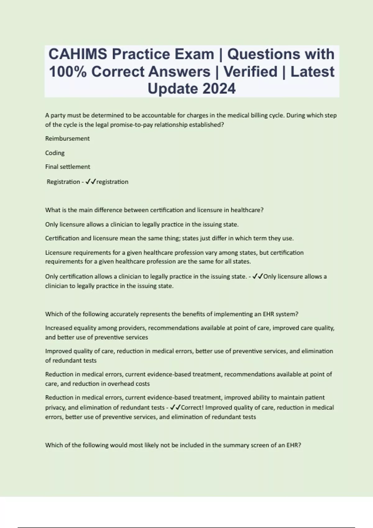 CAHIMS Practice Exam | Questions with 100% Correct Answers | Verified | Latest Update 2024