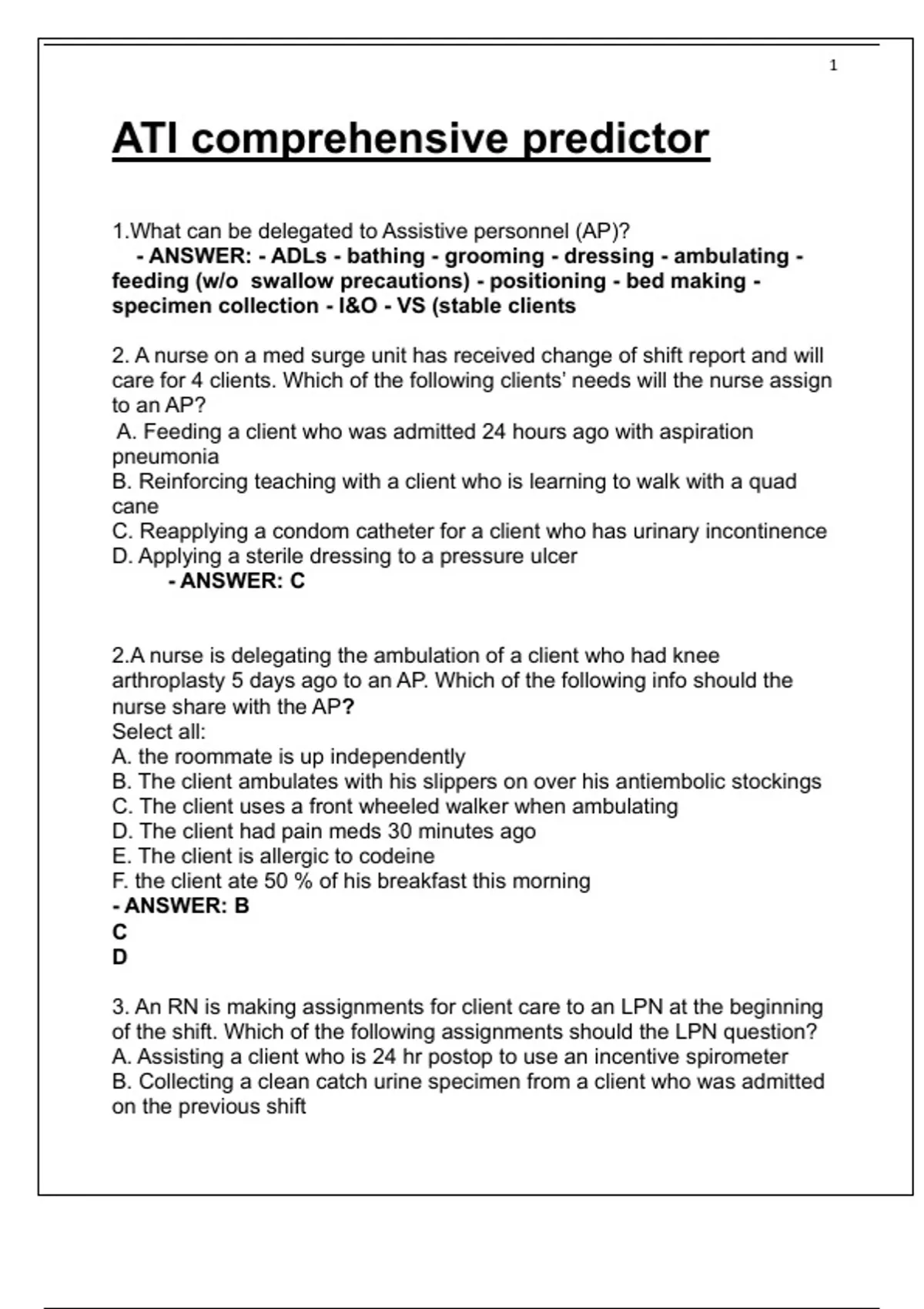 ATI comprehensive predictor 1. What can be delegated to Assistive personnel (AP)? - ANSWER: - ADLs - bathing - grooming - dressing - ambulating - feeding (w/o swallow precautions) - positioning - bed making - specimen collection - I&O - VS (stable clients 2. A nurse on a med surge unit has received change of shift report and will care for 4 clients. Which of the following clients needs will the nurse assign to an AP? A. Feeding a client who was admitted 24 hours ago with aspiration pneumonia B. Reinforcing teaching with a client who is learning to walk with a quad cane C. Reapplying a condom catheter for a client who has urinary incontinence D. Applying a sterile dressing to a pressure ulcer - ANSWER: C 2. A nurse is delegating the ambulation of a client who had knee arthroplasty 5 days ago to an AP. Which of the following info should the nurse share with the AP? Select all: A. the roommate is up independently B. The client ambulates with his slippers on over his antiembolic stockings C. The client uses a front wheeled walker when ambulating D. The client had pain meds 30 minutes ago E. The client is allergic to codeine F. the client ate 50 % of his breakfast this morning - ANSWER: B C D 3. An RN is making assignments for client care to an LPN at the beginning of the shift. Which of the following assignments should the LPN question? A. Assisting a client who is 24 hr postop to use an incentive spirometer B. Collecting a clean catch urine specimen from a client who was admitted on the previous shift C. providing nasopharyngeal suctioning for a client who has pneumonia D. Replacing the cartridge and tubing on a PCA pump - ANSWER: D 4. A nurse is preparing an inservice program about delegation. Which of the following elements should she identify when presenting the 5 rights of delegation. Select all: A. Right client B. Right supervision/evaluation C. Right direction/communication D. Right ti