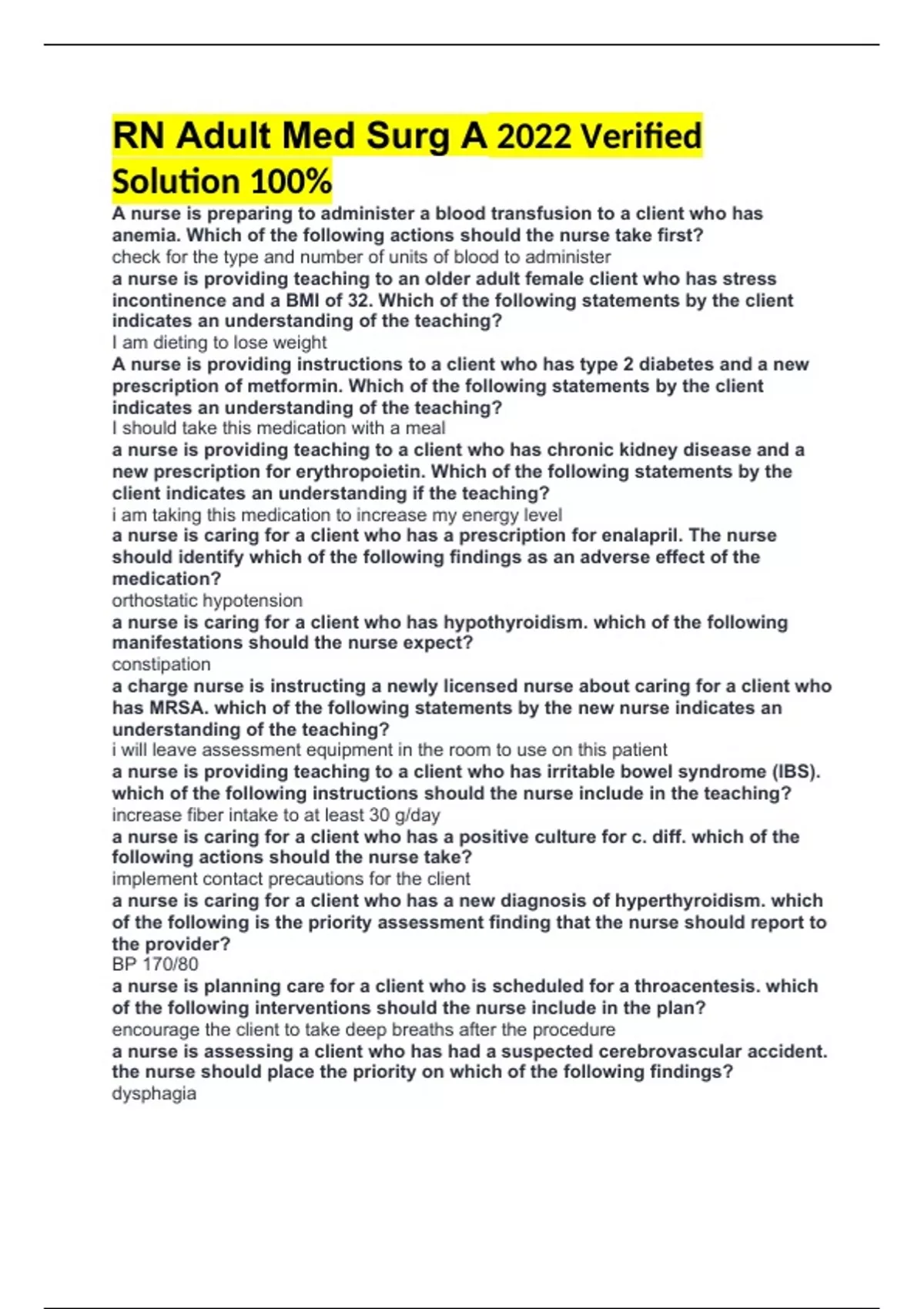 - RN Adult Med Surg A 2022 Verified Solution 100%