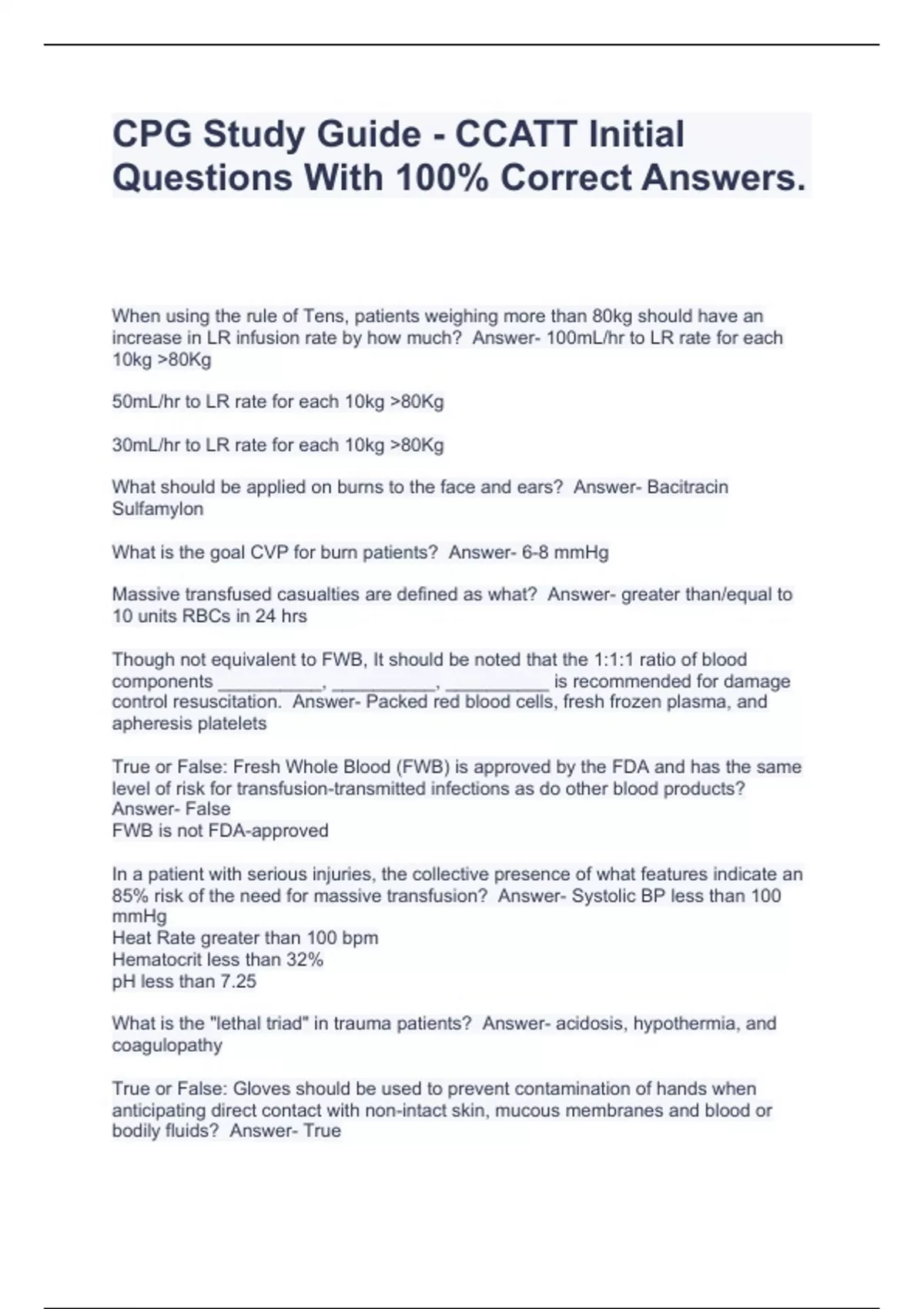 CPG Study Guide - CCATT Initial Questions With 100% Correct Answers.
