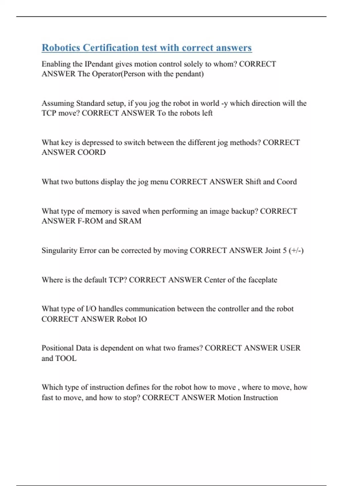 Enabling the IPendant gives motion control solely to whom? CORRECT ANSWER The Operator(Person with the pendant) Assuming Standard setup, if you jog the robot in world -y which direction will the TCP move? CORRECT ANSWER To the robots left What key is depressed to switch between the different jog methods? CORRECT ANSWER COORD What two buttons display the jog menu CORRECT ANSWER Shift and Coord What type of memory is saved when performing an image backup? CORRECT ANSWER F-ROM and SRAM Singularity Error can be corrected by moving CORRECT ANSWER Joint 5 (+/-) Where is the default TCP? CORRECT ANSWER Center of the faceplate What type of I/O handles communication between the controller and the robot CORRECT ANSWER Robot IO Positional Data is dependent on what two frames? CORRECT ANSWER USER and TOOL Which type of instruction defines for the robot how to move , where to move, how fast to move, and how to stop? CORRECT ANSWER Motion