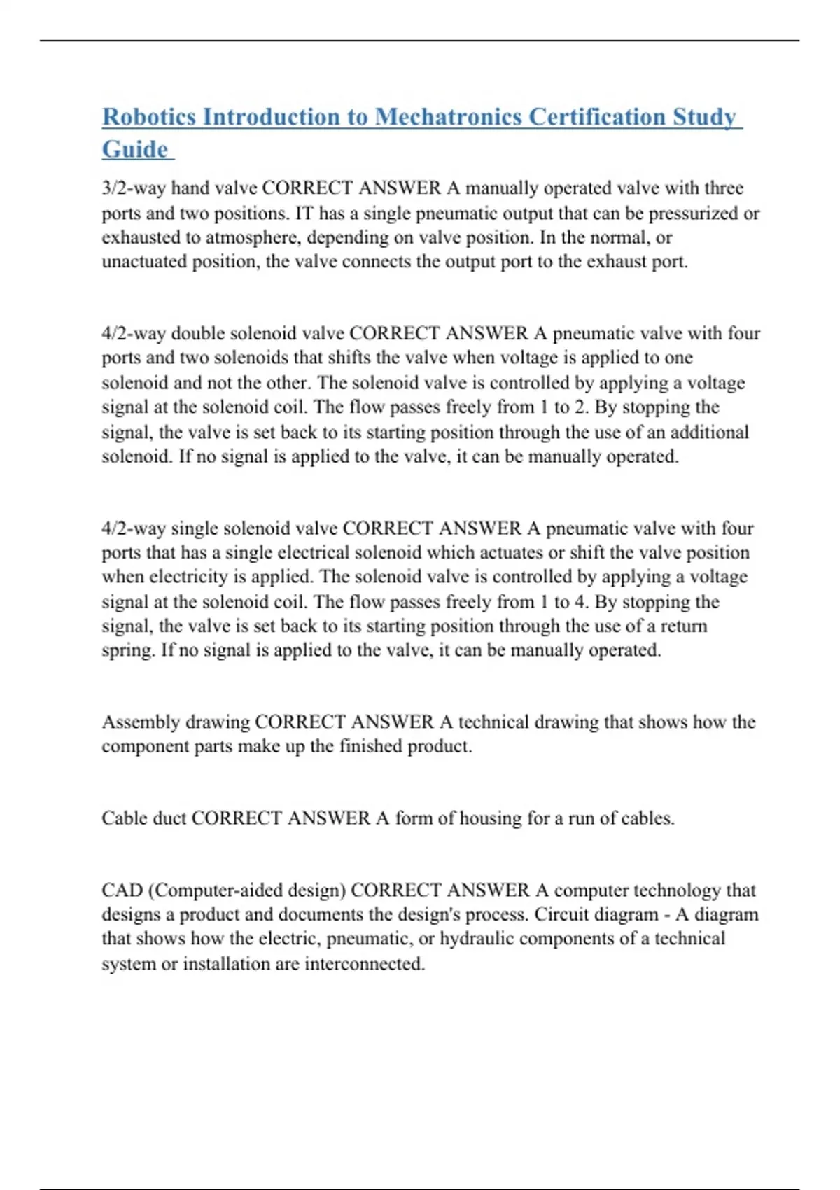 3/2-way hand valve CORRECT ANSWER A manually operated valve with three ports and two positions. IT has a single pneumatic output that can be pressurized or exhausted to atmosphere, depending on valve position. In the normal, or unactuated position, the valve connects the output port to the exhaust port. 4/2-way double solenoid valve CORRECT ANSWER A pneumatic valve with four ports and two solenoids that shifts the valve when voltage is applied to one solenoid and not the other. The solenoid valve is controlled by applying a voltage signal at the solenoid coil. The flow passes freely from 1 to 2. By stopping the signal, the valve is set back to its starting position through the use of an additional solenoid. If no signal is applied to the valve, it can be manually operated. 4/2-way single solenoid valve CORRECT ANSWER A pneumatic valve with four ports that has a single electrical solenoid which actuates or shift the valve position when electricity is applied. The solenoid valve is controlled by applying a voltage signal at the solenoid coil. The flow passes freely from 1 to 4. By stopping the signal, the valve is set back to its starting position through the use of a return spring. If no signal is applied to the valve, it can be manually operated. Assembly drawing CORRECT ANSWER A technical drawing that shows how the component parts make up the finished product. Cable duct CORRECT ANSWER A form of housing for a run of cables. CAD (Computer-aided design) CORRECT ANSWER A computer technology that designs a product and documents the design's process. Circuit diagram - A diagram that shows how the electric, pneumatic, or hydraulic components of a technical system or installation are interconnected.
