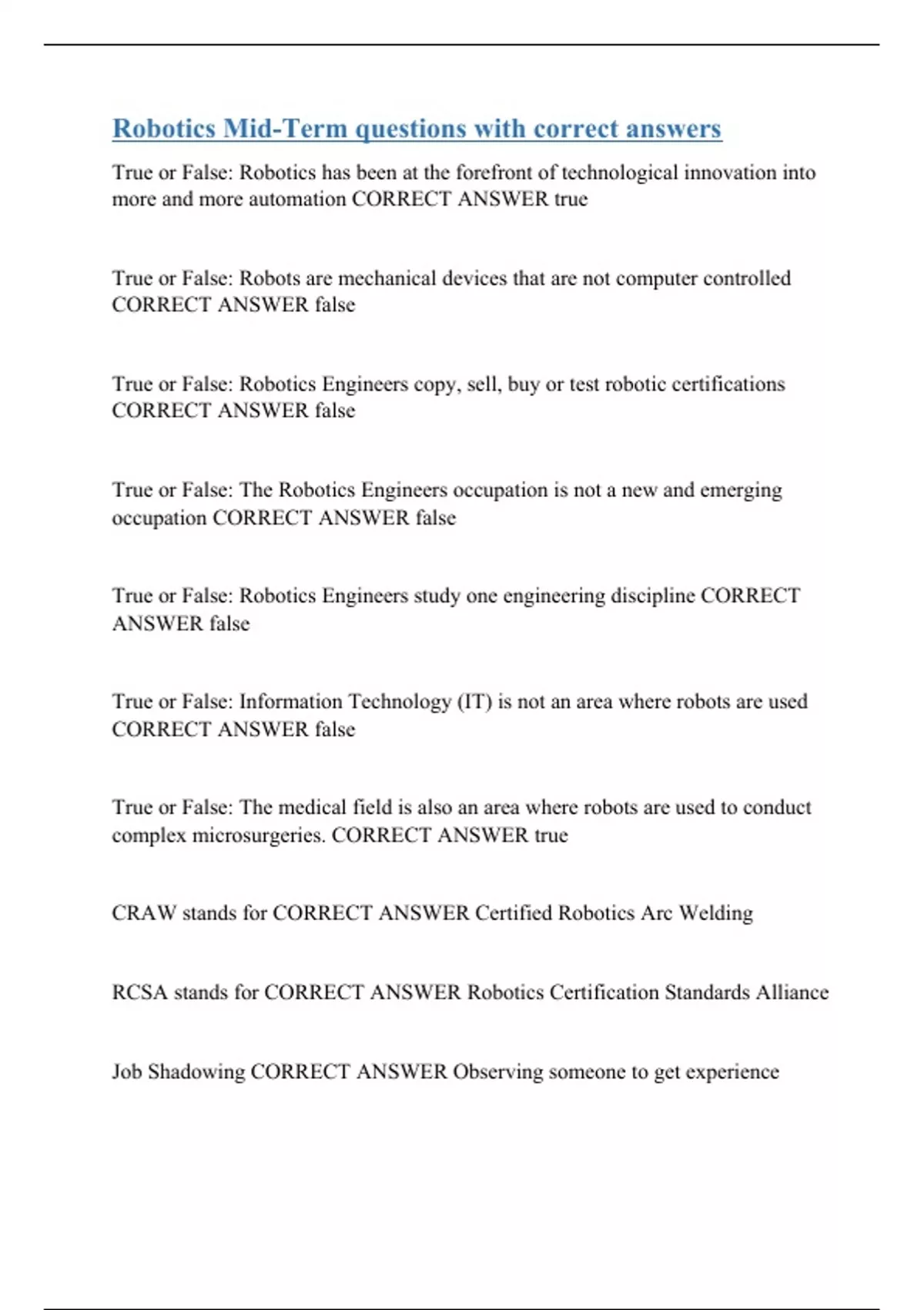 True or False: Robotics has been at the forefront of technological innovation into more and more automation CORRECT ANSWER true True or False: Robots are mechanical devices that are not computer controlled CORRECT ANSWER false True or False: Robotics Engineers copy, sell, buy or test robotic certifications CORRECT ANSWER false True or False: The Robotics Engineers occupation is not a new and emerging occupation CORRECT ANSWER false True or False: Robotics Engineers study one engineering discipline CORRECT ANSWER false True or False: Information Technology (IT) is not an area where robots are used CORRECT ANSWER false True or False: The medical field is also an area where robots are used to conduct complex microsurgeries. CORRECT ANSWER true CRAW stands for CORRECT ANSWER Certified Robotics Arc Welding RCSA stands for CORRECT ANSWER Robotics Certification Standards Alliance
