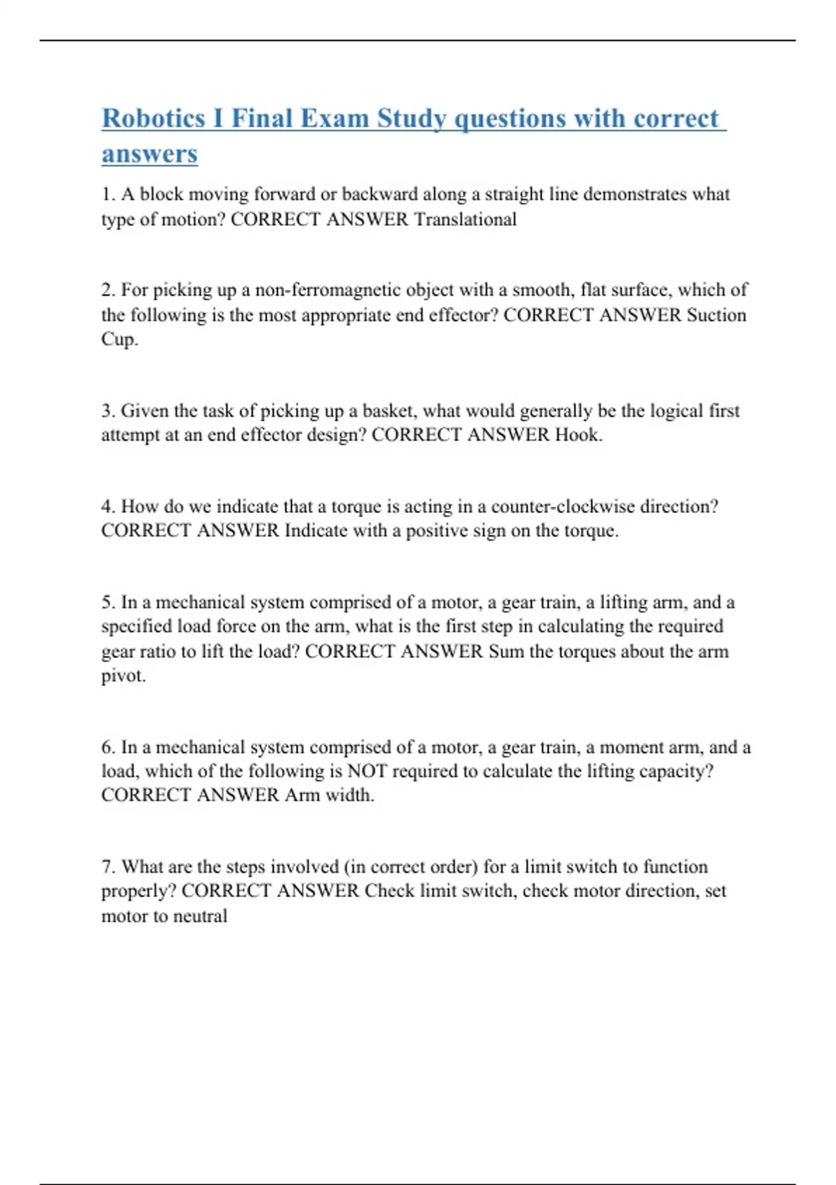 1. A block moving forward or backward along a straight line demonstrates what type of motion? CORRECT ANSWER Translational 2. For picking up a non-ferromagnetic object with a smooth, flat surface, which of the following is the most appropriate end effector? CORRECT ANSWER Suction Cup. 3. Given the task of picking up a basket, what would generally be the logical first attempt at an end effector design? CORRECT ANSWER Hook. 4. How do we indicate that a torque is acting in a counter-clockwise direction? CORRECT ANSWER Indicate with a positive sign on the torque. 5. In a mechanical system comprised of a motor, a gear train, a lifting arm, and a specified load force on the arm, what is the first step in calculating the required gear ratio to lift the load? CORRECT ANSWER Sum the torques about the arm pivot. 6. In a mechanical system comprised of a motor, a gear train, a moment arm, and a load, which of the following is NOT required to calculate the lifting capacity? CORRECT ANSWER Arm width. 7. What are the steps involved (in correct order) for a limit switch to function properly? CORRECT ANSWER Check limit switch, check motor direction, set motor to neutral
