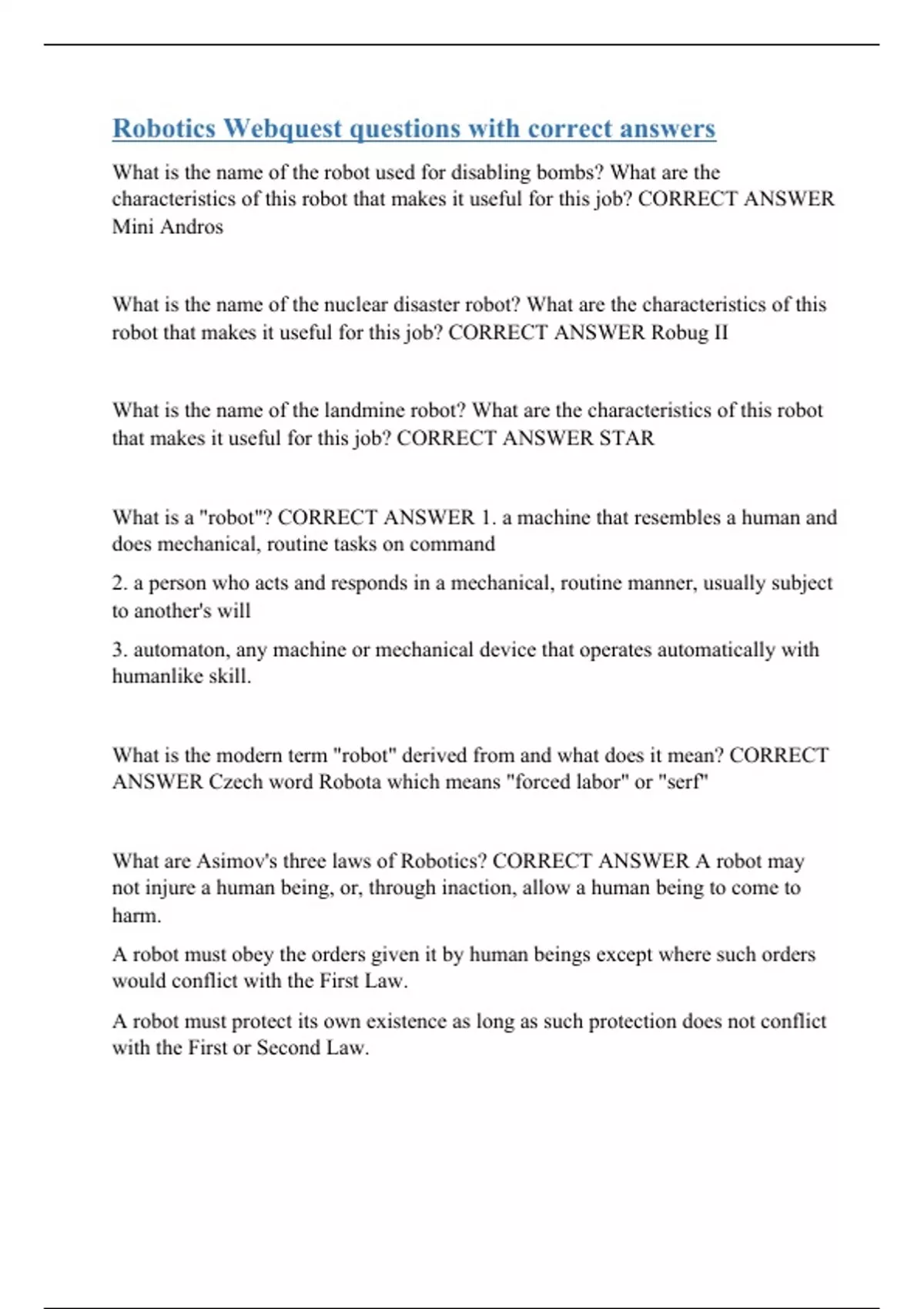 What is the name of the robot used for disabling bombs? What are the characteristics of this robot that makes it useful for this job? CORRECT ANSWER Mini Andros What is the name of the nuclear disaster robot? What are the characteristics of this robot that makes it useful for this job? CORRECT ANSWER Robug II What is the name of the landmine robot? What are the characteristics of this robot that makes it useful for this job? CORRECT ANSWER STAR What is a "robot"? CORRECT ANSWER 1. a machine that resembles a human and does mechanical, routine tasks on command 2. a person who acts and responds in a mechanical, routine manner, usually subject to another's will 3. automaton, any machine or mechanical device that operates automatically with humanlike skill. What is the modern term "robot" derived from and what does it mean? CORRECT ANSWER Czech word Robota which means "forced labor" or "serf" What are Asimov's three laws of Robotics? CORRECT ANSWER A robot may not injure a human being, or, through inaction, allow a human being to come to harm. A robot must obey the orders given it by human beings except where such orders would conflict with the First Law. A robot must protect its own existence as long as such protection does not conflict with the First or Second Law.
