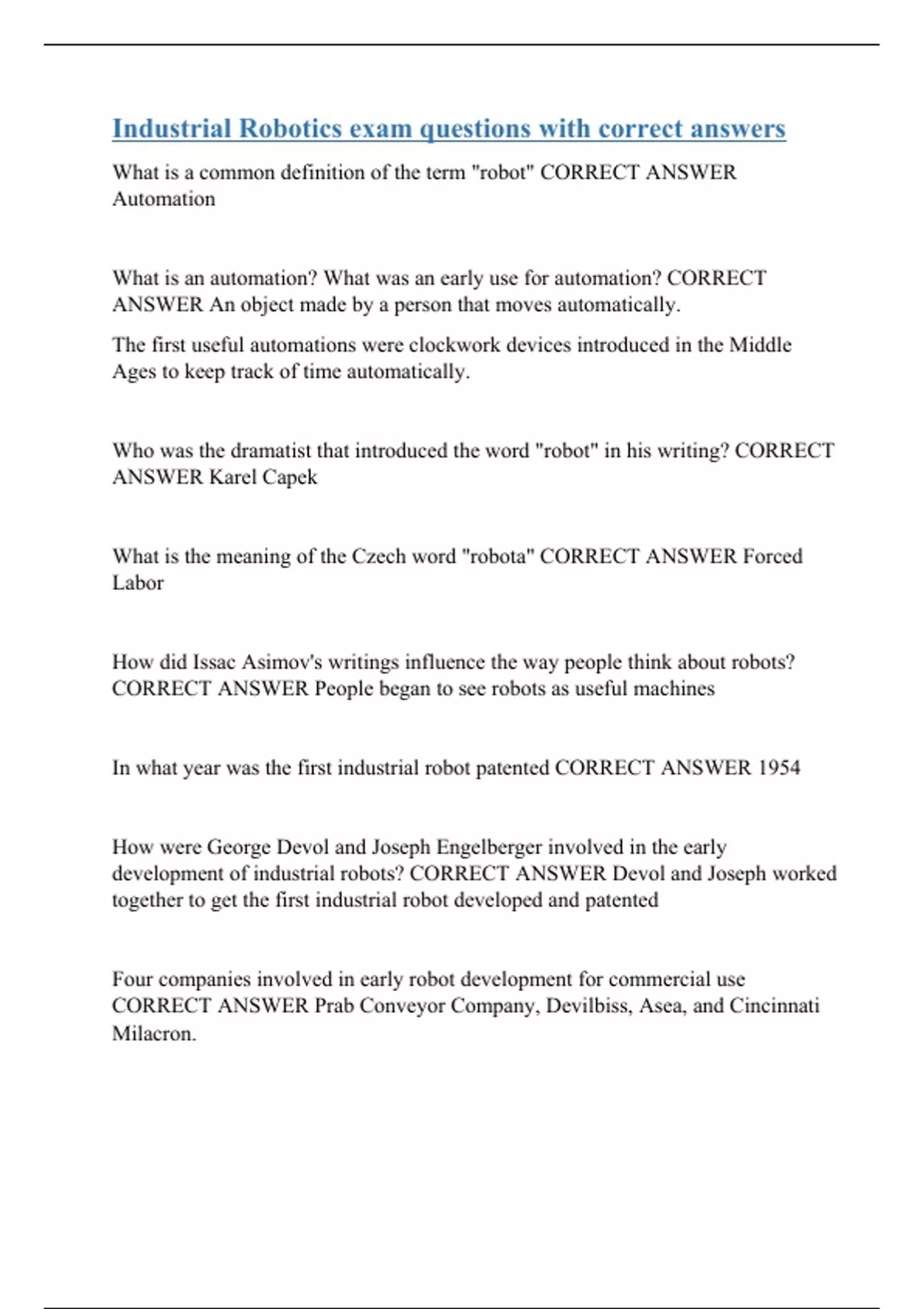 Industrial Robotics exam questions with correct answers