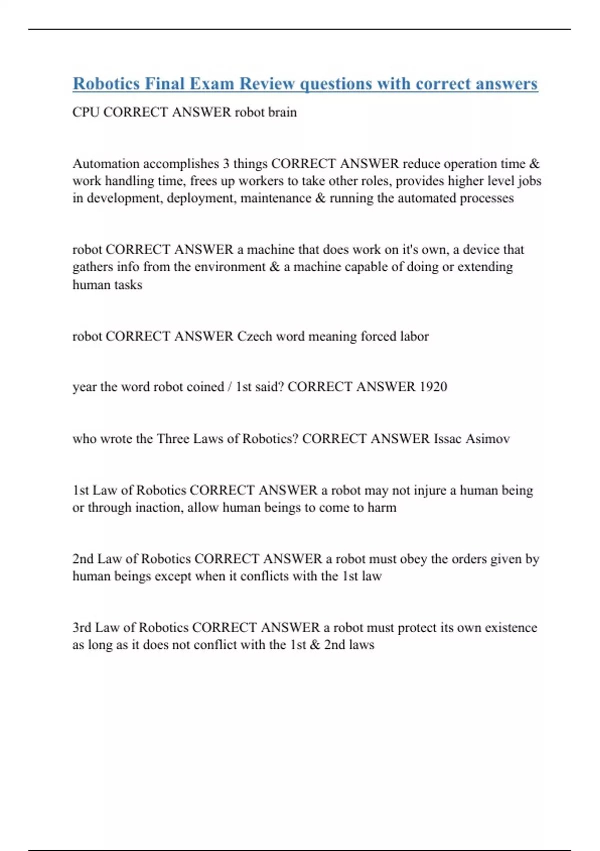 CPU CORRECT ANSWER robot brain Automation accomplishes 3 things CORRECT ANSWER reduce operation time & work handling time, frees up workers to take other roles, provides higher level jobs in development, deployment, maintenance & running the automated processes robot CORRECT ANSWER a machine that does work on it's own, a device that gathers info from the environment & a machine capable of doing or extending human tasks robot CORRECT ANSWER Czech word meaning forced labor year the word robot coined / 1st said? CORRECT ANSWER 1920 who wrote the Three Laws of Robotics? CORRECT ANSWER Issac Asimov 1st Law of Robotics CORRECT ANSWER a robot may not injure a human being or through inaction, allow human beings to come to harm 2nd Law of Robotics CORRECT ANSWER a robot must obey the orders given by human beings except when it conflicts with the 1st law 3rd Law of Robotics CORRECT ANSWER a robot must protect its own existence as long as it does not conflict with the 1st & 2nd laws