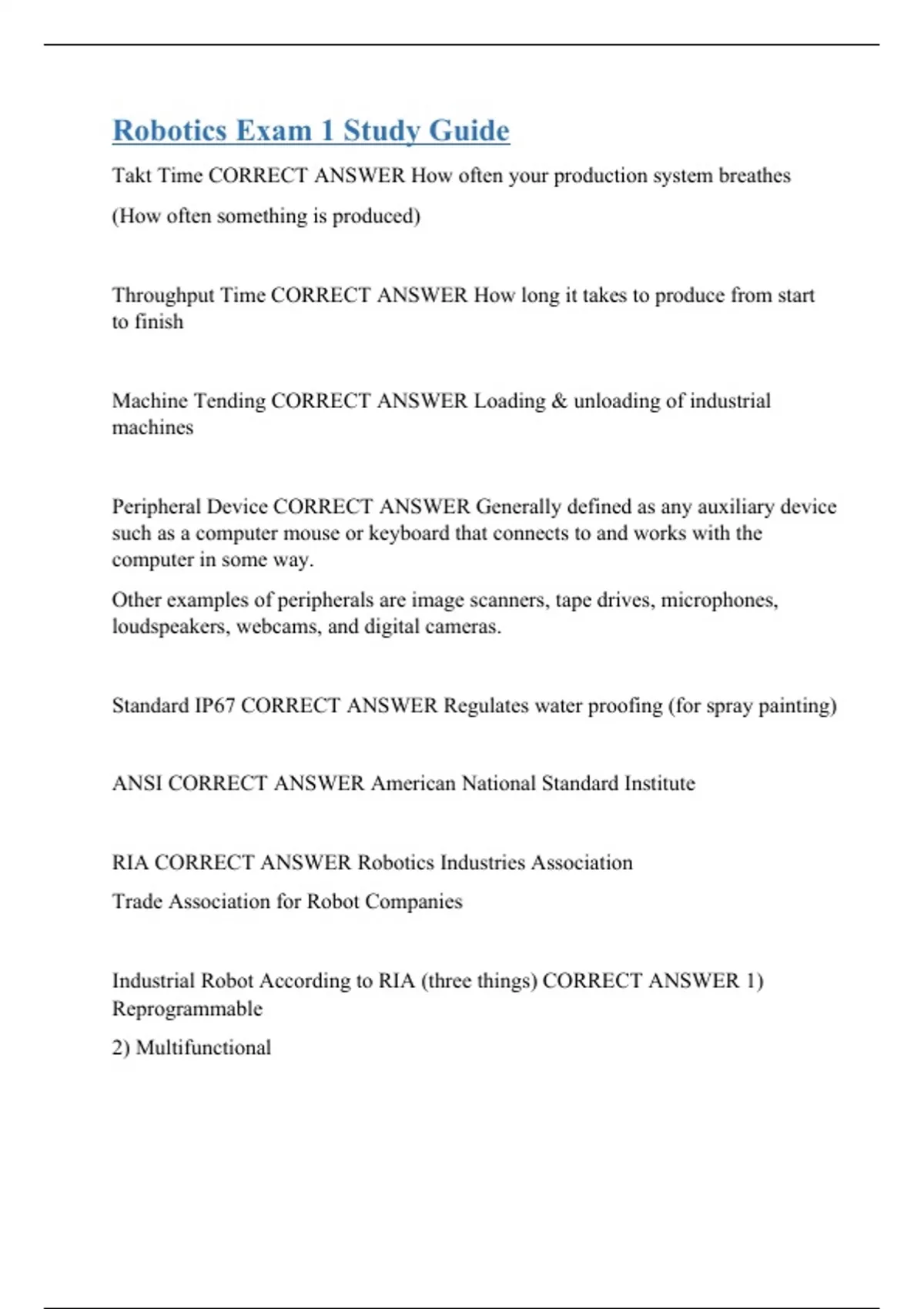 Takt Time CORRECT ANSWER How often your production system breathes (How often something is produced) Throughput Time CORRECT ANSWER How long it takes to produce from start to finish Machine Tending CORRECT ANSWER Loading & unloading of industrial machines Peripheral Device CORRECT ANSWER Generally defined as any auxiliary device such as a computer mouse or keyboard that connects to and works with the computer in some way. Other examples of peripherals are image scanners, tape drives, microphones, loudspeakers, webcams, and digital cameras. Standard IP67 CORRECT ANSWER Regulates water proofing (for spray painting) ANSI CORRECT ANSWER American National Standard Institute RIA CORRECT ANSWER Robotics Industries Association Trade Association for Robot Companies Industrial Robot According to RIA (three things) CORRECT ANSWER 1) Reprogrammable