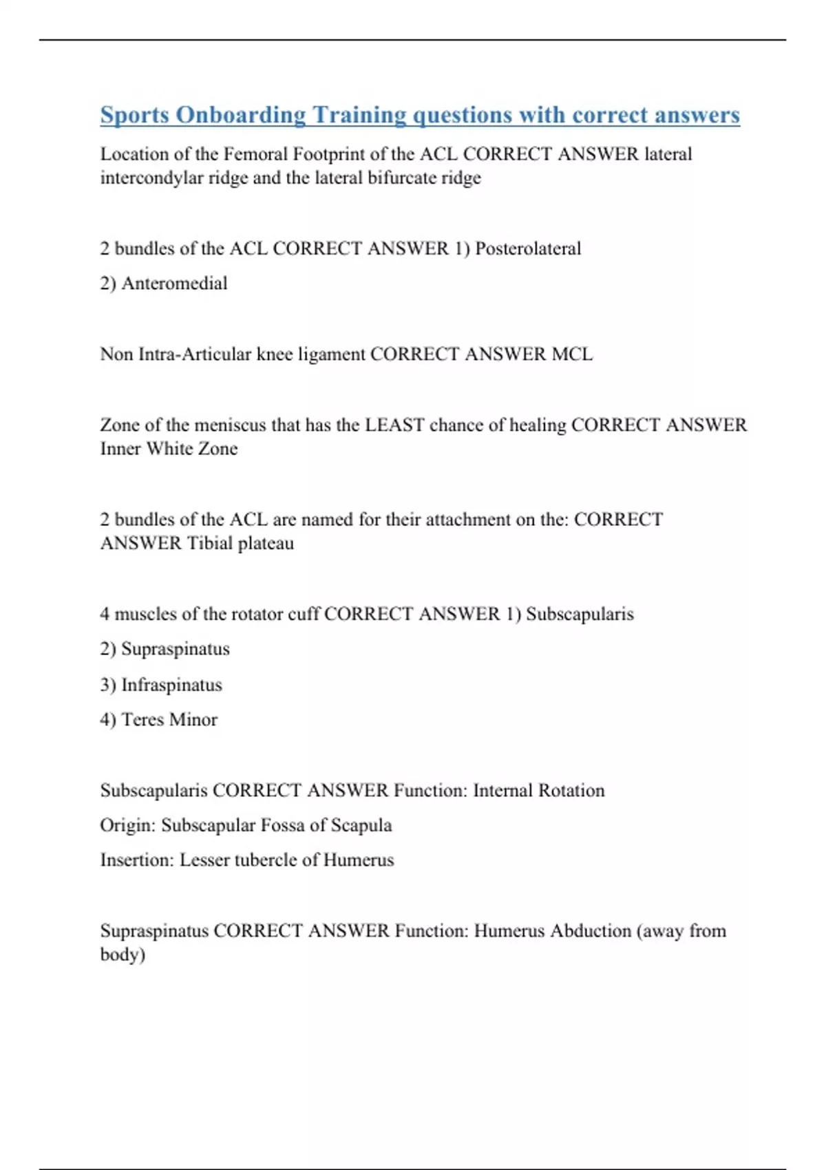 Location of the Femoral Footprint of the ACL CORRECT ANSWER lateral intercondylar ridge and the lateral bifurcate ridge 2 bundles of the ACL CORRECT ANSWER 1) Posterolateral 2) Anteromedial Non Intra-Articular knee ligament CORRECT ANSWER MCL Zone of the meniscus that has the LEAST chance of healing CORRECT ANSWER Inner White Zone 2 bundles of the ACL are named for their attachment on the: CORRECT ANSWER Tibial plateau 4 muscles of the rotator cuff C