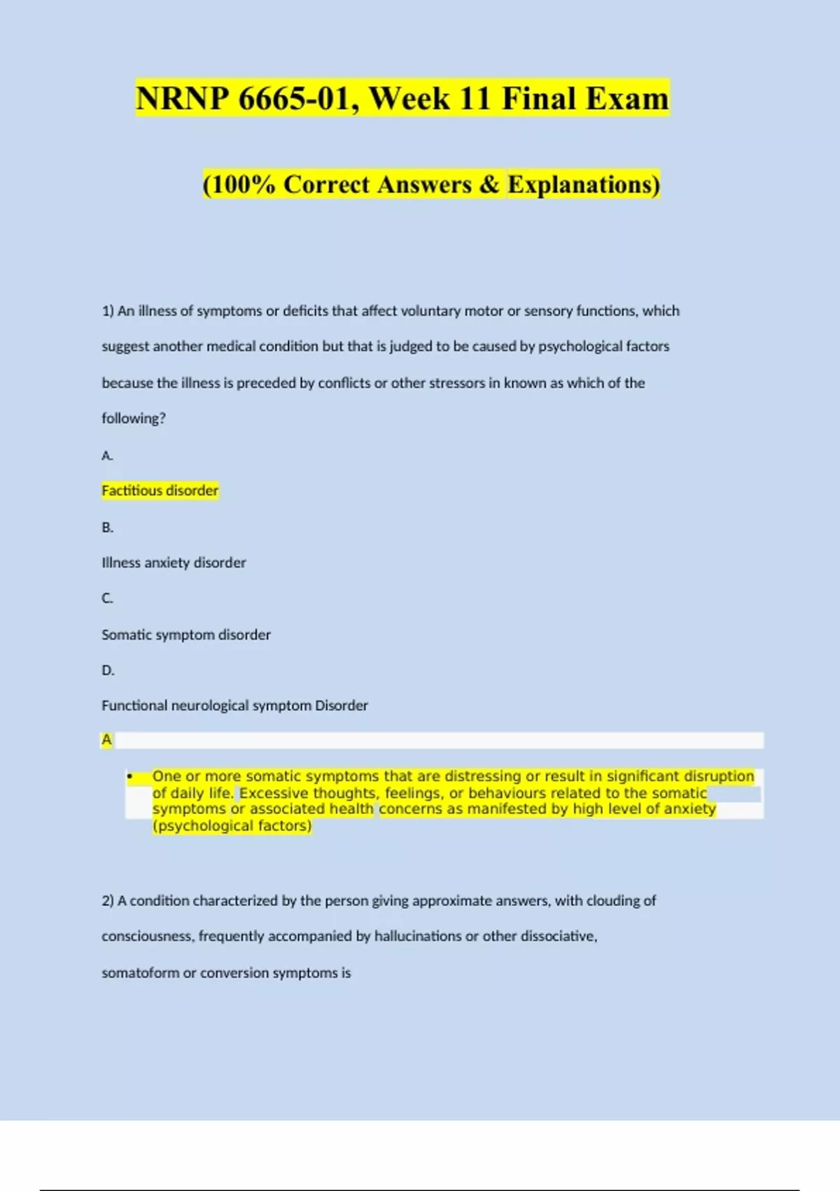 NRNP 6665 PMHNP ALL FULL BUNDLES NRNP 6665-01, Week 11 Final Exam NRNP 6665 PMHNP Care Across the Lifespan I Week 4 Mood Disorders in Adults Assignment. NRNP 6665 PMHNP Care Across the Lifespan I Week 8 Pyromania Study Guide Assignment