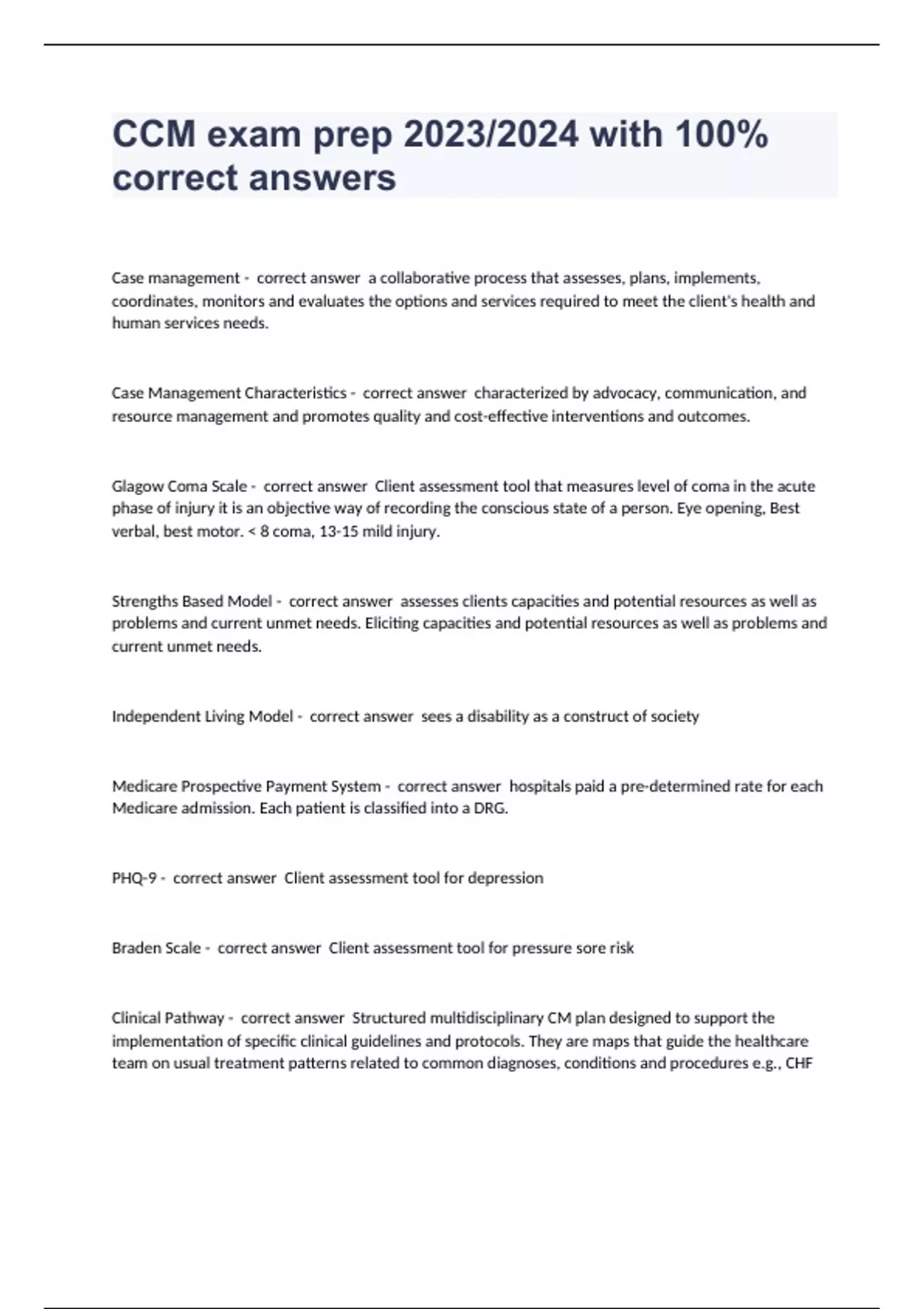 Case management - correct answer a collaborative process that assesses, plans, implements, coordinates, monitors and evaluates the options and services required to meet the client's health and human services needs. Case Management Characteristics - correct answer characterized by advocacy, communication, and resource management and promotes quality and cost-effective interventions and outcomes. Glagow Coma Scale - correct answer Client assessment tool that measures level of coma in the acute phase of injury it is an objective way of recording the conscious state of a person. Eye opening, Best verbal, best motor. < 8 coma, 13-15 mild injury. Strengths Based Model - correct answer assesses clients capacities and potential resources as well as problems and current unmet needs. Eliciting capacities and potential resources as well as problems and current unmet needs. Independent Living Model - correct answer sees a disability as a construct of society Medicare Prospective Payment System - correct answer hospitals paid a pre-determined rate for each Medicare admission. Each patient is classified into a DRG. PHQ-9 - correct answer Client assessment tool for depression Braden Scale - correct answer Client assessment tool for pressure sore risk Clinical Pathway - correct answer Structured multidisciplinary CM plan designed to support the implementation of specific clinical guidelines and protocols. They are maps that guide the healthcare team on usual treatment patterns related to common diagnoses, conditions and procedures e.g., CHF