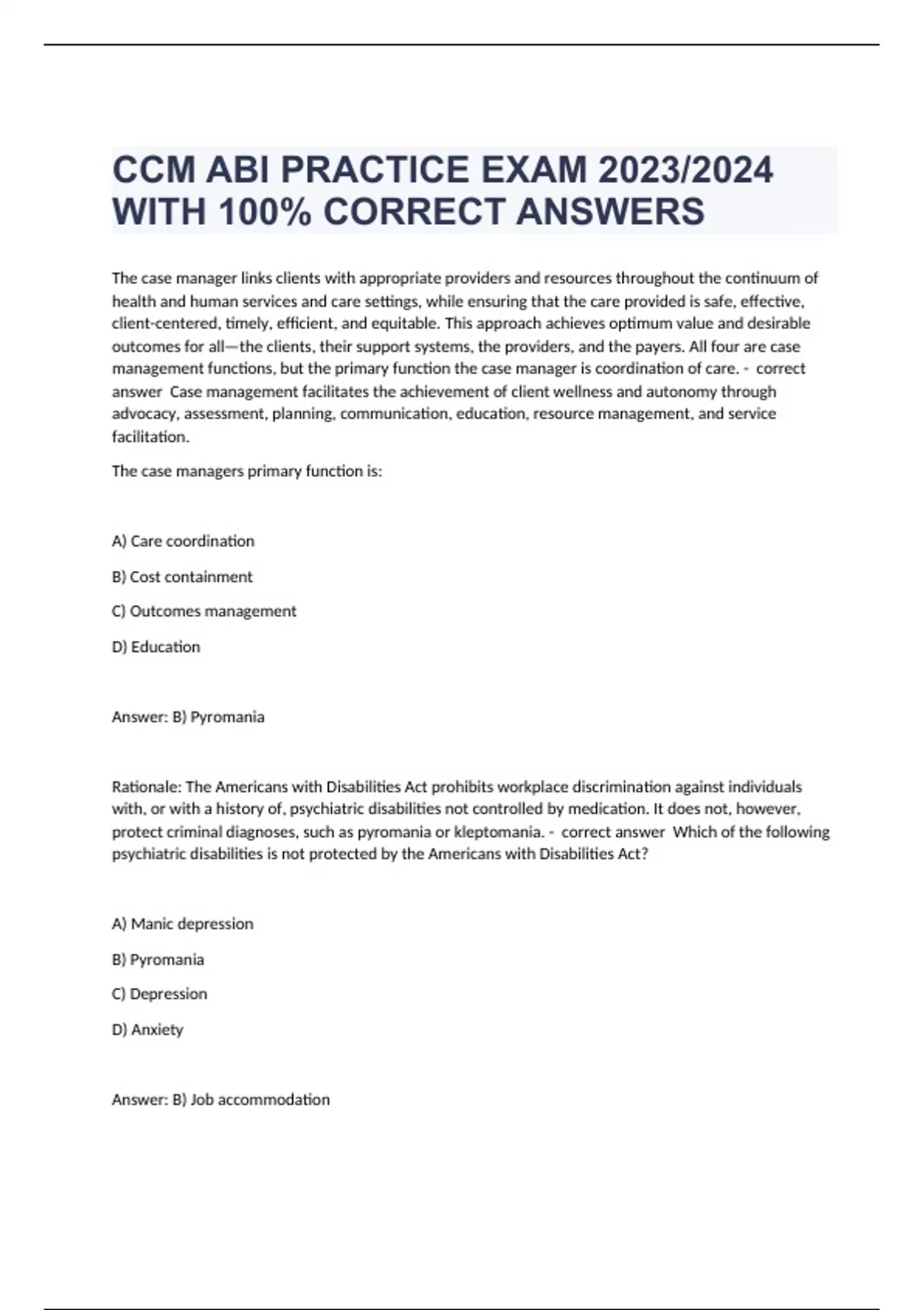The case manager links clients with appropriate providers and resources throughout the continuum of health and human services and care settings, while ensuring that the care provided is safe, effective, client-centered, timely, efficient, and equitable. This approach achieves optimum value and desirable outcomes for all—the clients, their support systems, the providers, and the payers. All four are case management functions, but the primary function the case manager is coordination of care. - correct answer Case management facilitates the achievement of client wellness and autonomy through advocacy, assessment, planning, communication, education, resource management, and service facilitation. The case managers primary function is: A) Care coordination B) Cost containment C) Outcomes management D) Education Answer: B) Pyromania Rationale: The Americans with Disabilities Act prohibits workplace discrimination against individuals with, or with a history of, psychiatric disabilities not controlled by medication. It does not, however, protect criminal diagnoses, such as pyromania or kleptomania. - correct answer Which of the following psychiatric disabilities is not protected by the Americans with Disabilities Act? A) Manic depression B) Pyromania C) Depression D) Anxiety Answer: B) Job accommodation Rational