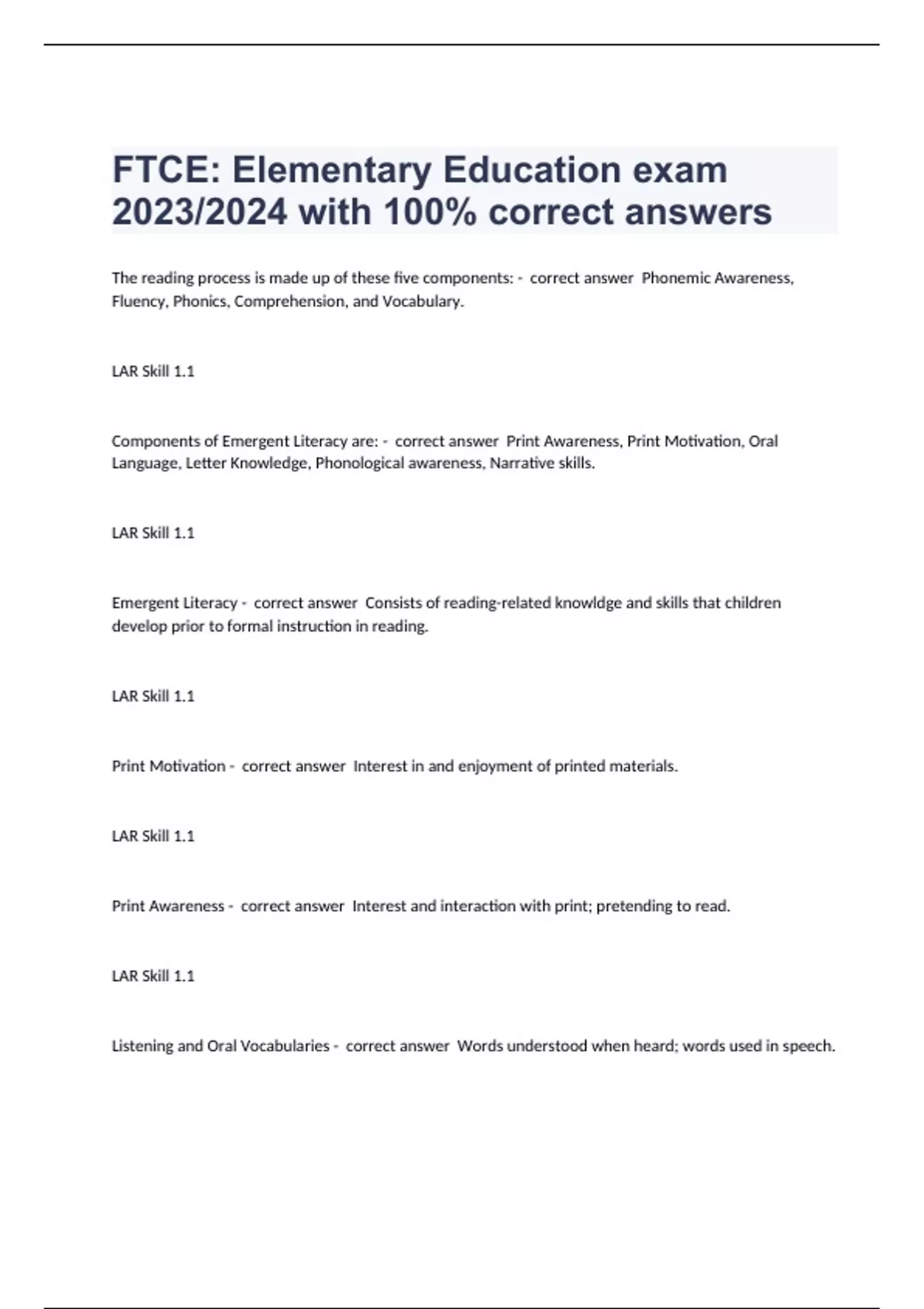 FTCE: Elementary Education exam 2023/2024 with 100% correct answers