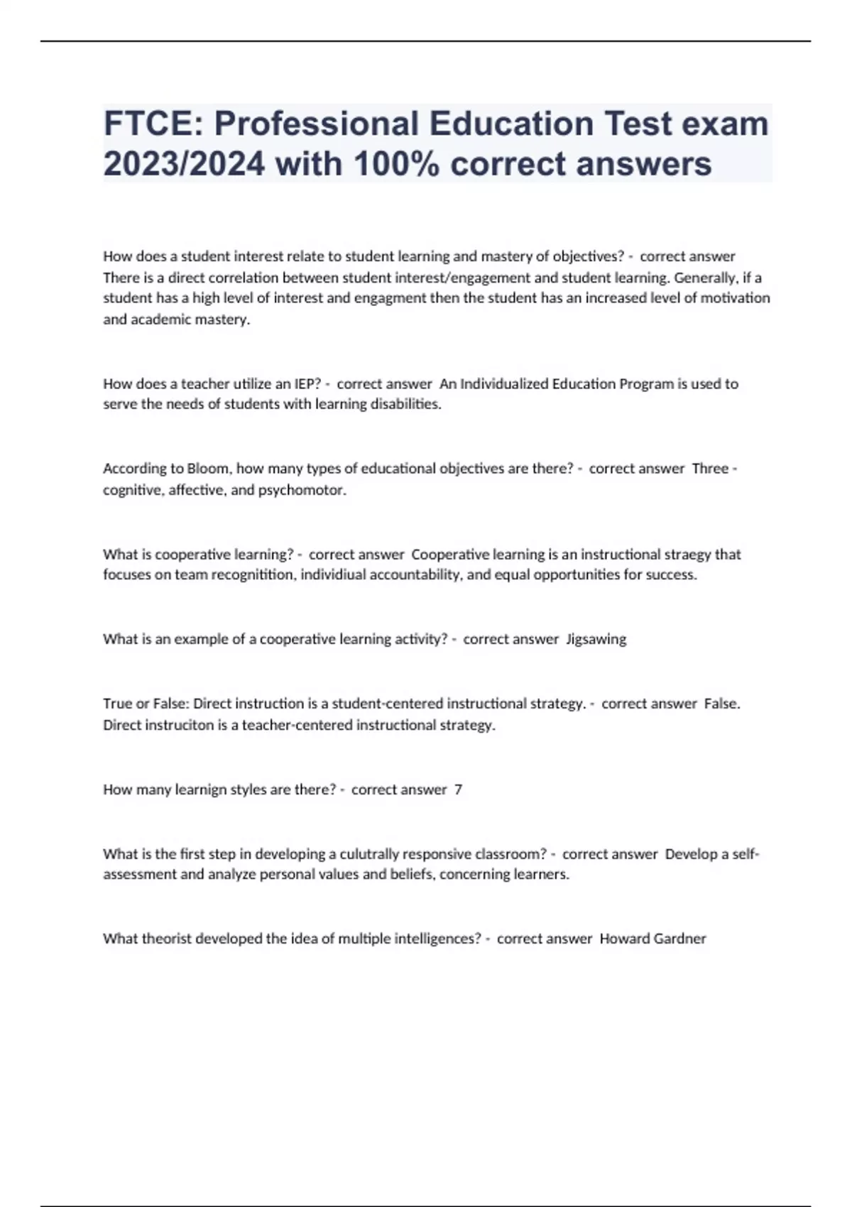 How does a student interest relate to student learning and mastery of objectives? - correct answer There is a direct correlation between student interest/engagement and student learning. Generally, if a student has a high level of interest and engagment then the student has an increased level of motivation and academic mastery. How does a teacher utilize an IEP? - correct answer An Individualized Education Program is used to serve the needs of students with learning disabilities. According to Bloom, how many types of educational objectives are there? - correct answer Three - cognitive, affective, and psychomotor. What is cooperative learning? - correct answer Cooperative learning is an instructional straegy that focuses on team recognitition, individiual accountability, and equal opportunities for success. What is an example of a cooperative learning activity? - correct answer Jigsawing True or False: Direct instruction is a student-centered instructional strategy. - correct answer False. Direct instruciton is a teacher-centered instructional strategy. How many learnign styles are there? - correct answer 7 What is the first step in developing a culutrally responsive classroom? - correct answer Develop a self-assessment and analyze personal values and beliefs, concerning learners. What theorist developed the idea of multiple intelligences? - correct answer Howard Gardner