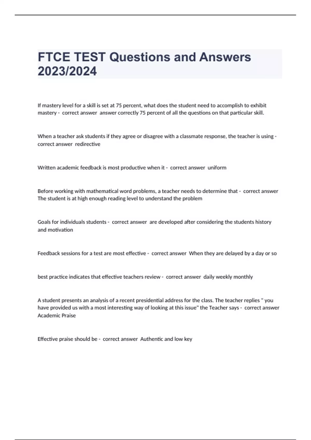 If mastery level for a skill is set at 75 percent, what does the student need to accomplish to exhibit mastery - correct answer answer correctly 75 percent of all the questions on that particular skill. When a teacher ask students if they agree or disagree with a classmate response, the teacher is using - correct answer redirective Written academic feedback is most productive when it - correct answer uniform Before working with mathematical word problems, a teacher needs to determine that - correct answer The student is at high enough reading level to understand the problem Goals for individuals students - correct answer are developed after considering the students history and motivation Feedback sessions for a test are most effective - correct answer When they are delayed by a day or so best practice indicates that effective teachers review - correct answer daily weekly monthly A student presents an analysis of a recent presidential address for the class. The teacher replies " you have provided us with a most interesting way of looking at this issue" the Teacher says - correct answer Academic Praise Effective praise should be - correct answer Authentic and low key