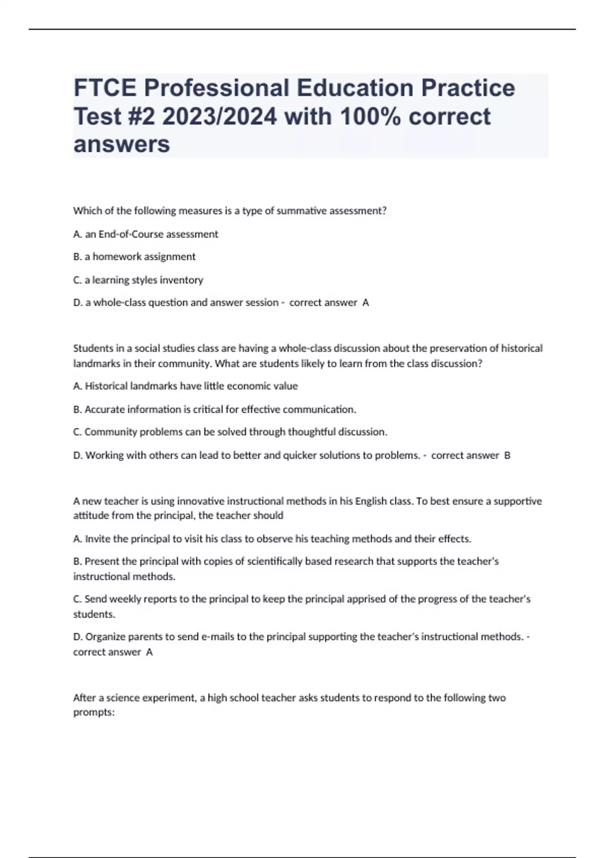 Which of the following measures is a type of summative assessment? A. an End-of-Course assessment B. a homework assignment C. a learning styles inventory D. a whole-class question and answer session - correct answer A Students in a social studies class are having a whole-class discussion about the preservation of historical landmarks in their community. What are students likely to learn from the class discussion? A. Historical landmarks have little economic value B. Accurate information is critical for effective communication. C. Community problems can be solved through thoughtful discussion. D. Working with others can lead to better and quicker solutions to problems. - correct answer B A new teacher is using innovative instructional methods in his English class. To best ensure a supportive attitude from the principal, the teacher should A. Invite the principal to visit his class to observe his teaching methods and their effects. B. Present the principal with copies of scientifically based research that supports the teacher's instructional methods. C. Send weekly reports to the principal to keep the principal apprised of the progress of the teacher's students. D. Organize parents to send e-mails to the principal supporting the teacher's instructional methods. - correct answer A After a science experiment, a high school teacher asks students to respond to the following two prompts: 1. Justify the results of your experiment. 2. Formulate a theory based on the results of your experiment. The major be
