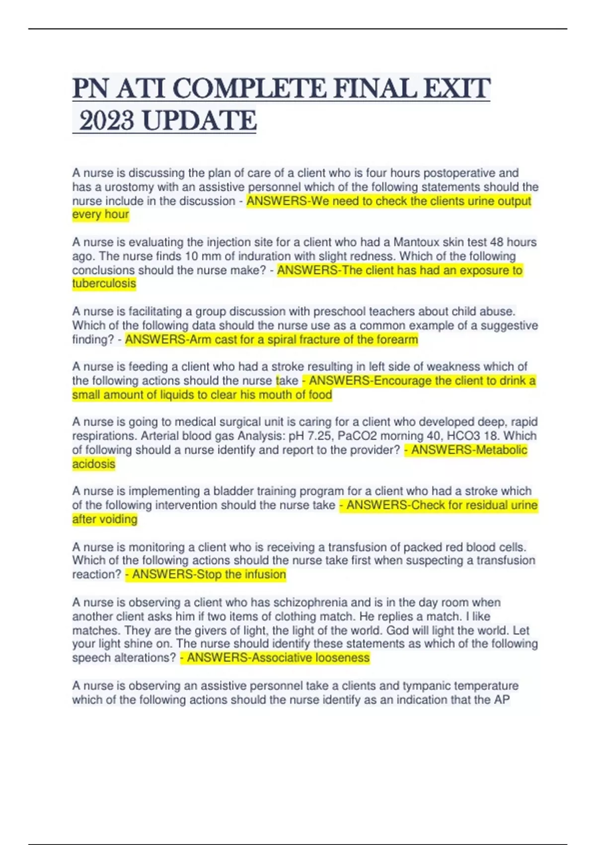 PN ATI COMPLETE FINAL EXIT 2023 UPDATE A nurse is discussing the plan of care of a client who is four hours postoperative and has a urostomy with an assistive personnel which of the following statements should the nurse include in the discussion - ANSWERS-We need to check the clients urine output every hour A nurse is evaluating the injection site for a client who had a Mantoux skin test 48 hours ago. The nurse finds 10 mm of induration with slight redness. Which of the following conclusions should the nurse make? - ANSWERS-The client has had an exposure to tuberculosis A nurse is facilitating a group discussion with preschool teachers about child abuse. Which of the following data should the nurse use as a common example of a suggestive finding? - ANSWERS-Arm cast for a spiral fracture of the forearm A nurse is feeding a client who had a stroke resulting in left side of weakness which of the following actions should the nurse take - ANSWERS-Encourage the client to drink a small amount of liquids to clear his mouth of food A nurse is going to medical surgical unit is caring for a client who developed deep, rapid respirations. Arterial blood gas Analysis: pH 7.25, PaCO2 morning 40, HCO3 18. Which of following should a nurse identify and report to the provider? - ANSWERS-Metabolic acidosis A nurse is implementing a bladder training program for a client who had a stroke which of the following intervention should the nurse take - ANSWERS-Check for residual urine after voiding A nurse is monitoring a client who is receiving a transfusion of packed red blood cells. Which of the following actions should the nurse take first when suspecting a transfusion reaction? - ANSWERS-Stop the infusion A nurse is observing a client who has schizophrenia and is in the day room when another client asks him if two items of clothing match. He replies a match. I like matches. They are the givers of light, the light of the world. God will light the world. Let your light shine on. The nurse should identify these statements as which of the following speech alterations? - ANSWERS-Associative looseness A nurse is observing an assistive personnel take a clients and tympanic temperature which of the following actions should the nurse identify as an indication that the AP understands how to perform the procedure - ANSWERS-The AP pulls the pinna up and back A nurse is participating in a performance improvement program which of the following actions should the nurse take to evaluate the effectiveness of the program - ANSWERS-Review the facilitys policy and procedure manual A nurse is performing an abdominal assessment as part of a client's comprehensive physical examination which of the following should the nurse perform? - ANSWERSPalpation A nurse is performing gastric lavage for a client who has upper gastrointestinal bleeding. Which of the following actions should the nurse take? - ANSWERS-Insert a large bore NG TUBE A nurse is planning a community health program about Parkinson's disease. Which of the following is are the tertiary prevention? - ANSWERS-Provide daily exercise classes to improve ambulation for a client who has Parkinson's disease A nurse is planning care for a client who has an L4 spinal cord injury. Which of the following interventions to prevent skin breakdown should the nurse include in the plan of care? - ANSWERS-Ask the client to shift his weight every 20 minutes while sitting in a chair A nurse is planning care for a client who has bipolar disorder and is experiencing Mania. Which of the following interventions should the nurse include in the plan? - ANSWERSEncourage the client to frequent rest periods A nurse is planning care for a client who has cancer and is about to receive low-dose brachytherapy via vaginal implant. Which of the following interventions should the nurse include plan of care? - ANSWERS-Insertion of an indwelling urinary catheter A nurse is planning care for a client who has unilateral paralysis and dysphagia following a right hemisphere stroke. Which of the following interventions should the nurse include in the plan? - ANSWERS-place the client left arm on a pillow while she is sitting A nurse is planning care for a client who is receiving hemodialysis. Which of the following actions should the nurse include in the plan of care? - ANSWERS-Check the vascular access site for bleeding after dialysis A nurse is planning care for a client who is six hours postoperative following a right knee arthroplasty which of the following interventions should the nurse include in the clients plan of care? - ANSWERS-Use the continuous passive motion machine intermittently