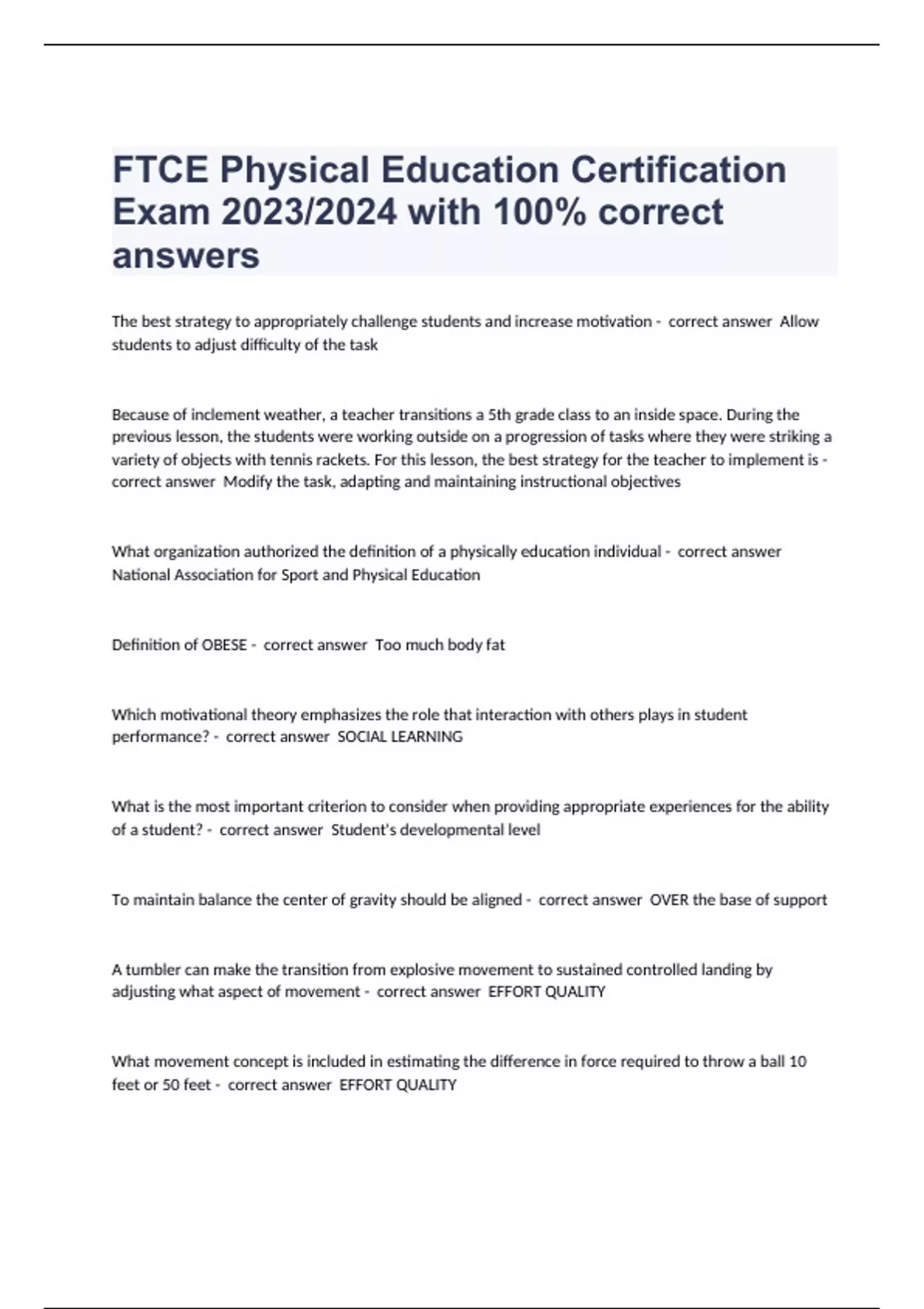 The best strategy to appropriately challenge students and increase motivation - correct answer Allow students to adjust difficulty of the task Because of inclement weather, a teacher transitions a 5th grade class to an inside space. During the previous lesson, the students were working outside on a progression of tasks where they were striking a variety of objects with tennis rackets. For this lesson, the best strategy for the teacher to implement is - correct answer Modify the task, adapting and maintaining instructional objectives What organization authorized the definition of a physically education individual - correct answer National Association for Sport and Physical Education Definition of OBESE - correct answer Too much body fat Which motivational theory emphasizes the role that interaction with others plays in student performance? - correct answer SOCIAL LEARNING What is the most important criterion to consider when providing appropriate experiences for the ability of a student? - correct answer Student's developmental level To maintain balance the center of gravity should be aligned - correct answer OVER the base of support A tumbler can make the transition from explosive movement to sustained controlled landing by adjusting what aspect of movement - correct answer EFFORT QUALITY What movement concept is included in estimating the difference in force required to throw a ball 10 feet or 50 feet - correct answer EFFORT QUALITY As student
