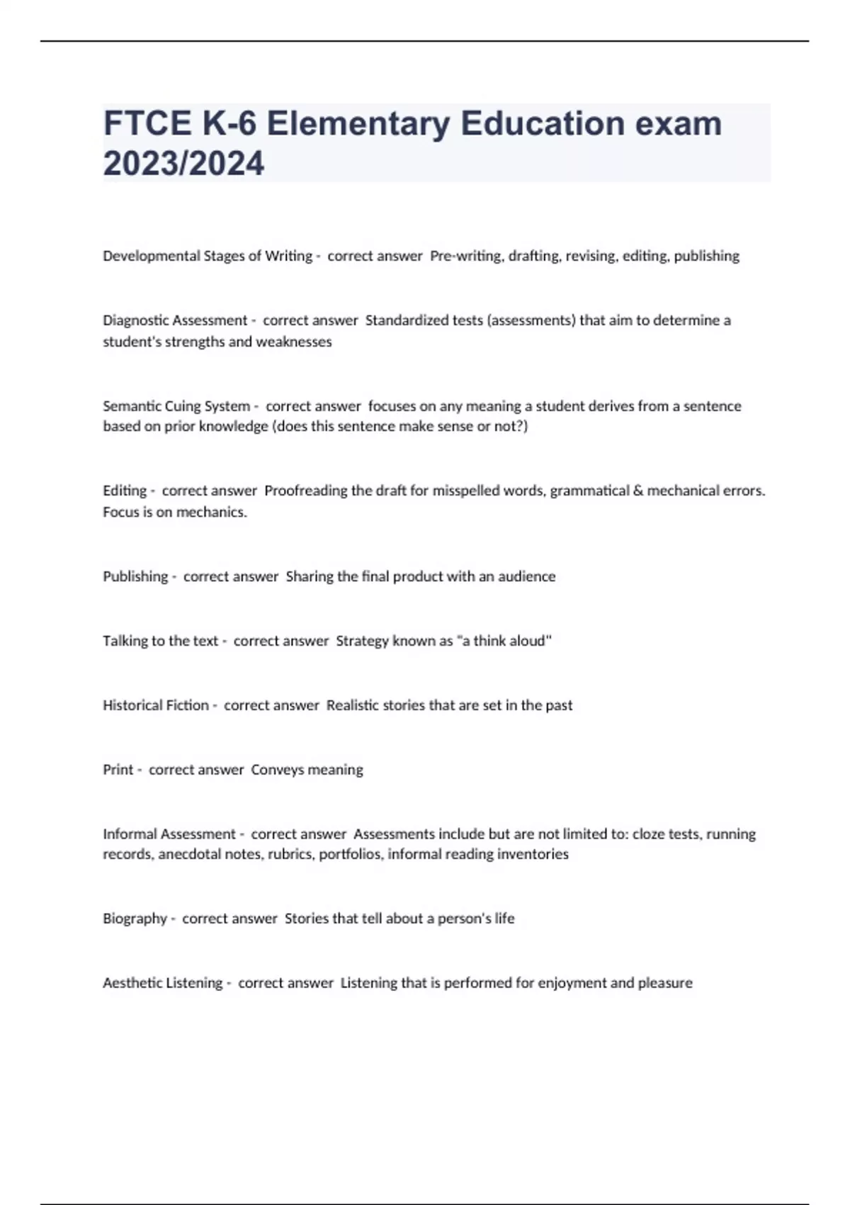 Developmental Stages of Writing - correct answer Pre-writing, drafting, revising, editing, publishing Diagnostic Assessment - correct answer Standardized tests (assessments) that aim to determine a student's strengths and weaknesses Semantic Cuing System - correct answer focuses on any meaning a student derives from a sentence based on prior knowledge (does this sentence make sense or not?) Editing - correct answer Proofreading the draft for misspelled words, grammatical & mechanical errors. Focus is on mechanics. Publishing - correct answer Sharing the final product with an audience Talking to the text - correct answer Strategy known as "a think aloud" Historical Fiction - correct answer Realistic stories that are set in the past Print - correct answer Conveys meaning Informal Assessment - correct answer Assessments include but are not limited to: cloze tests, running records, anecdotal notes, rubrics, portfolios, informal reading inventories Biography - correct answer Stories that tell about a person's life Aesthetic Listening - correct answer Listening that is performed for enjoyment and pleasure