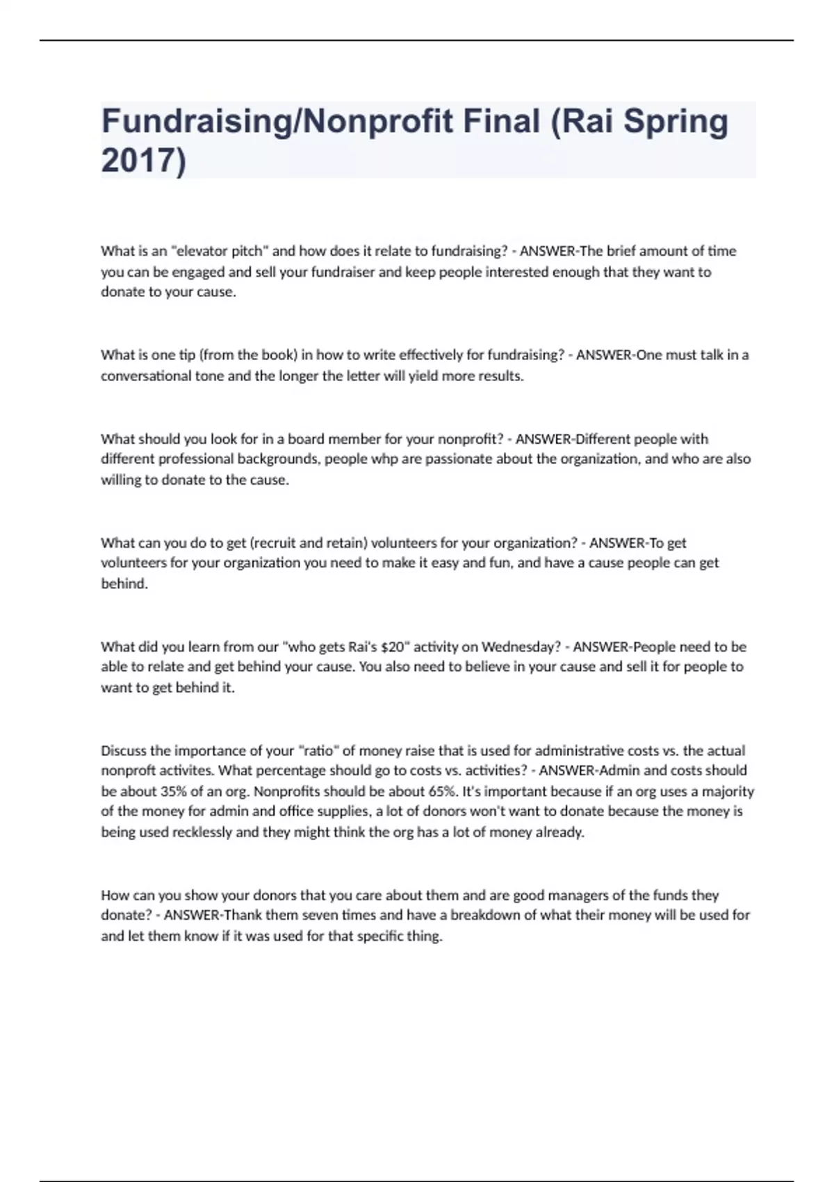 Fundraising/Nonprofit Final (Rai Spring 2017) What is an "elevator pitch" and how does it relate to fundraising? - ANSWER-The brief amount of time you can be engaged and sell your fundraiser and keep people interested enough that they want to donate to your cause. What is one tip (from the book) in how to write effectively for fundraising? - ANSWER-One must talk in a conversational tone and the longer the letter will yield more results. What should you look for in a board member for your nonprofit? - ANSWER-Different people with different professional backgrounds, people whp are passionate about the organization, and who are also willing to donate to the cause. What can you do to get (recruit and retain) volunteers for your organization? - ANSWER-To get volunteers for your organization you need to make it easy and fun, and have a cause people can get behind. What did you learn from our "who gets Rai's $20" activity on Wednesday? - ANSWER-People need to be able to relate and get behind your cause. You also need to believe in your cause and sell it for people to want to get behind it. Discuss the importance of your "ratio" of money raise that is used for administrative costs vs. the actual nonproft activites. What percentage should go to costs vs. activities? - ANSWER-Admin and costs should be about 35% of an org. Nonprofits should be about 65%. It's important because if an org uses a majority of the money for admin and office supplies, a lot of donors won't want to donate because the money is being used recklessly and they might think the org has a lot of money already. How can you show your donors that you care about them and are good managers of the funds they donate? - ANSWER-Thank them seven times and have a breakdown of what their money will be used for and let them know if it was used for that specific thing.
