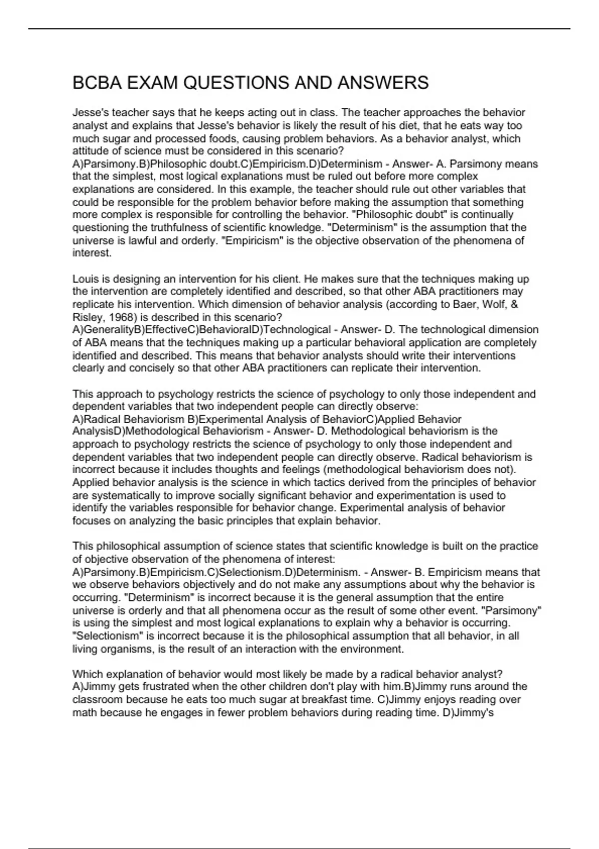 Jesse's teacher says that he keeps acting out in class. The teacher approaches the behavior analyst and explains that Jesse's behavior is likely the result of his diet, that he eats way too much sugar and processed foods, causing problem behaviors. As a behavior analyst, which attitude of science must be considered in this scenario? A)Parsimony.B)Philosophic doubt.C)Empiricism.D)Determinism - Answer- A. Parsimony means that the simplest, most logical explanations must be ruled out before more complex explanations are considered. In this example, the teacher should rule out other variables that could be responsible for the problem behavior before making the assumption that something more complex is responsible for controlling the behavior. "Philosophic doubt" is continually questioning the truthfulness of scientific knowledge. "Determinism" is the assumption that the universe is lawful and orderly. "Empiricism" is the objective observation of the phenomena of interest. Louis is designing an intervention for his client. He makes sure that the techniques making up the intervention are completely identified and described, so that other ABA practitioners may replicate his intervention. Which dimension of behavior analysis (according to Baer, Wolf, & Risley, 1968) is described in this scenario? A)GeneralityB)EffectiveC)BehavioralD)Technological - Answer- D. The technological dimension of ABA means that the techniques making up a particular behavioral application are completely identified and described. This means that behavior analysts should write their interventions clearly and concisely so that other ABA practitioners can replicate their intervention. This approach to psychology restricts the science of psychology to only those independent and dependent variables that two independent people can directly observe: A)Radical Behaviorism B)Experimental Analysis of BehaviorC)Applied Behavior AnalysisD)Methodological Behaviorism - Answer- D. Methodological behaviorism is the approach to psychology restricts the science of psychology to only those independent and dependent variables that two independent people can directly observe. Radical behaviorism is incorrect because it includes thoughts and feelings (methodological behaviorism does not). Applied behavior analysis is the science in which tactics derived from the principles of behavior are systematically to improve socially significant behavior and experimentation is used to identify the variables responsible for behavior change. Experimental analysis of behavior focuses on analyzing the basic principles that explain behavior. This philosophical assumption of science states that scientific knowledge is built on the practice of objective observation of the phenomena of interest: A)Parsimony.B)Empiricism.C)Selectionism.D)Determinism. - Answer- B. Empiricism means that we observe behaviors objectively and do not make any assumptions about why the behavior is occurring. "Determinism" is incorrect because it is the general assumption that the entire universe is orderly and that all phenomena occur as the result of some other event. "Parsimony" is using the simplest and most logical explanations to explain why a behavior is occurring. "Selectionism" is incorrect because it is the philosophical assumption that all behavior, in all living organisms, is the result of an interaction with the environment.