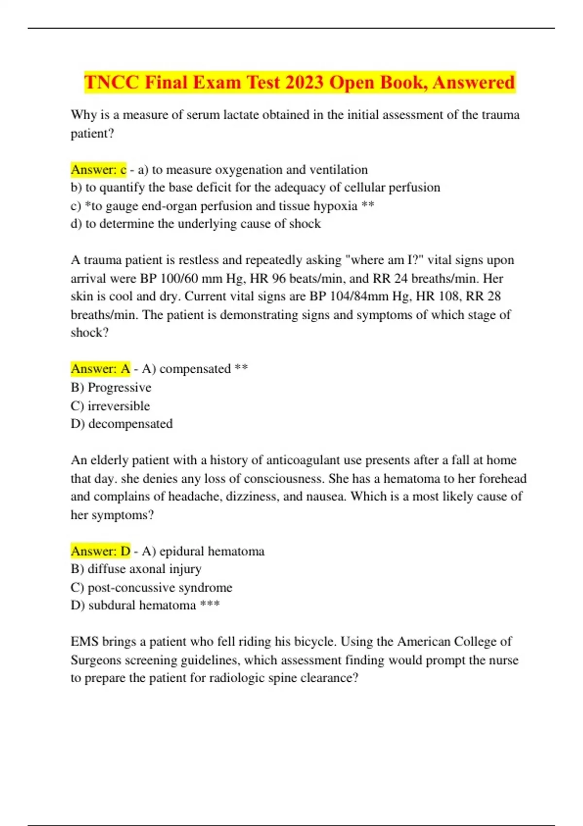 TNCC Final Exam Test 2023 Open Book, Answered-Why is a measure of serum lactate obtained in the initial assessment of the trauma patient? Answer: c - a) to measure oxygenation and ventilation b) to quantify the base deficit for the adequacy of cellular perfusion c) *to gauge end-organ perfusion and tissue hypoxia ** d) to determine the underlying cause of shock A trauma patient is restless and repeatedly asking "where am I?" vital signs upon arrival were BP 100/60 mm Hg, HR 96 beats/min, and RR 24 breaths/min. Her skin is cool and dry. Current vital signs are BP 104/84mm Hg, HR 108, RR 28 breaths/min. The patient is demonstrating signs and symptoms of which stage of shock? Answer: A - A) compensated ** B) Progressive C) irreversible D) decompensated An elderly patient with a history of anticoagulant use presents after a fall at home that day. she denies any loss of consciousness. She has a hematoma to her forehead and complains of headache, dizziness, and nausea. Which is a most likely cause of her symptoms? Answer: D - A) epidural hematoma B) diffuse axonal injury C) post-concussive syndrome D) subdural hematoma *** EMS brings a patient who fell riding his bicycle. Using the American College of Surgeons screening guidelines, which assessment finding would prompt the nurse to prepare the patient for radiologic spine clearance? Answer: D - A) Alert with no neurologic deficits B) Multiple abrasions to the extremities C) Multiple requests of water D) Smell of alcohol on breath *** Which of the following occurs during the third impact of a motor vehicle crash? Answer: C - A) The driver of the vehicle collides with the steering wheel B) the vehicle collides with a tree C) the aorta is torn at its attachment with the ligamentum arteriosum D) the airbag deploys and strikes the front seat passenger *** A passenger is brought to the emergency department of a rural hospital following a high-speed MVC. When significant abdominal and pelvic injuries are noted in the primary survey, which of the following is the priority interventions? Answer: A - A) initiate transfer to a trauma center ** B) provide report to the operating room nurse C) Obtained imaging studies D) Place a gastric tube Which of the following injuries is LEAST likely to be promptly identified? Answer: C - A) spleen B) lung C) bowel *** D) brain Patients with a crush injury should be monitored for which of the following conditions? Answer: C - A) Hypernatremia B) Hypercalcemia C) Dysrhthmias ** D) polyuria What finding raises suspicion of complete spinal cord injury? Answer: B - A) Weakness in the lower extremities B) Priapism *** C) voluntary anal sphincter tone D) intact reflexes distal to the injury A patient with a complete spinal cord injury in neurogenic shock will demonstrate hypotension and which other clinical signs? Answer: D - A) Bradycardia and ipsilateral absences of motor function B) Tachycardia and respiratory depression C) Tachycardia and absent motor function below the level of injury D) Bradycardia and absent motor function below the level of the injury ***