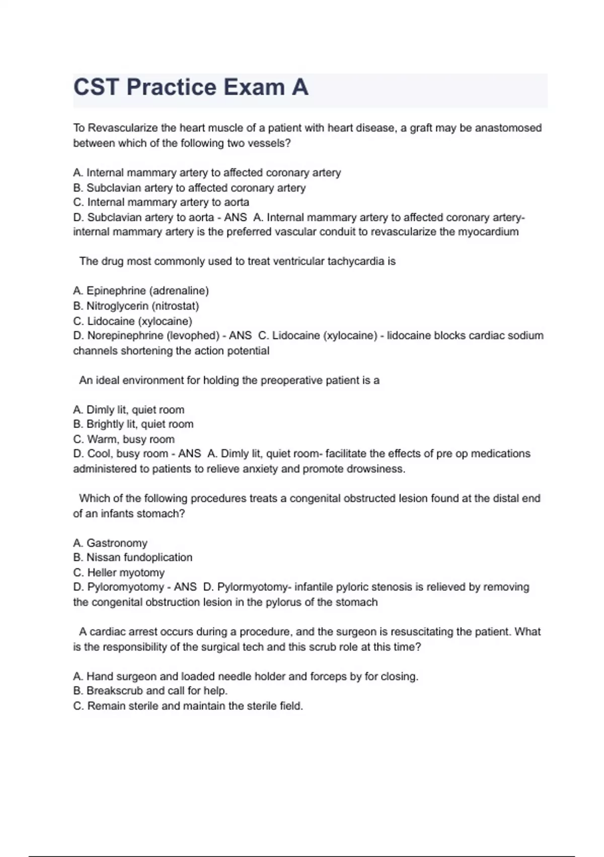 CST Practice Exam A To Revascularize the heart muscle of a patient with heart disease, a graft may be anastomosed between which of the following two vessels? A. Internal mammary artery to affected coronary artery B. Subclavian artery to affected coronary artery C. Internal mammary artery to aorta D. Subclavian artery to aorta - ANS A. Internal mammary artery to affected coronary artery- internal mammary artery is the preferred vascular conduit to revascularize the myocardium The drug most commonly used to treat ventricular tachycardia is A. Epinephrine (adrenaline) B. Nitroglycerin (nitrostat) C. Lidocaine (xylocaine) D. Norepinephrine (levophed) - ANS C. Lidocaine (xylocaine) - lidocaine blocks cardiac sodium channels shortening the action potential An ideal environment for holding the preoperative patient is a A. Dimly lit, quiet room B. Brightly lit, quiet room C. Warm, busy room D. Cool, busy room - ANS A. Dimly lit, quiet room- facilitate the effects of pre op medications administered to patients to relieve anxiety and promote drowsiness. Which of the following procedures treats a congenital obstructed lesion found at the distal end of an infants stomach? A. Gastronomy B. Nissan fundoplication C. Heller myotomy D. Pyloromyotomy - ANS D. Pylormyotomy- infantile pyloric stenosis is relieved by removing the congenital obstruction lesion in the pylorus of the stomach A cardiac arrest occurs during a procedure, and the surgeon is resuscitating the patient. What is the responsibility of the surgical tech and this scrub role at this time? A. Hand surgeon and loaded needle holder and forceps by for closing. B. Breakscrub and call for help. C. Remain sterile and maintain the sterile field. D. Move the electrosurgical unit (ESU) away from the operating table. - ANS D. Move the electrosurgical unit (ESU) away from the operating table. Which of the following is the definition of instrument sterilization? A. surgical cleaning with an antiseptic B. manual decontamination C. destruction of microorganisms D. reduction of bacteria - ANS C. Destruction of microorganisms A preference card indicates a surgeon prefers a large gown and size 7.5 gloves and the surgeons assistant prefers an XL gown and size 8 gloves. The assistant usually scrubs in first, in which order should the surgical attire (PPE) be stacked from top to bottom? A. Towel, XL gown, size 7.5 gloves, towel, large gown, size 8 gloves B. Size 7.5 gloves, XL gown, towel, size 8 gloves, large gown, towel C. Towel, XL gown, size 8 gloves, towel, large gown, size 7.5 gloves D. Towel, large gown, size 7.5 gloves, towel, XL gown, size 8 gloves - ANS C. Towel, XL gown, size 8 gloves, towel, large gown, size 7.5 gloves Which if the following types of anesthetic is injected during a Bier Block? A. Bupivacaine (Marcaine) B. Lidocaine ( Xylocaine) with epinephrine C. Bupivacaine (Marcaine) with epinephrine D. Lidocaine (Xylocaine) - ANS D. Lidocaine (Xylocaine)- lidocaine when used for regional bier block anesthesia. Does not carry as significant of a risk for anesthesia agent toxicity as Marcaine Aerobic organisms are BEST characterized as A. Pathogenic B. Nonpathogenic C. Oxygen requiring D. Non oxygen requiring - ANS C. Oxygen requiring- aerobic organisms require an oxygen rich environment to survive When positioning a patient in the lithotomy position, the stirrup height should be adjusted according to the A. Height of the first assistant B. Manufacturers recommendations C. Height of the surgeon D. Length of the patients legs - ANS D. Length of the patients legs - to prevent nerve pressure and damage Which of the following is applied as a non adherent dressing? A. Adaptic B. Collodion C. Elastoplast D. Steri-strip - ANS A. Adaptic Which of the following conditions is triggered by an injection of succinylcholine (anectime) and causes an unusually high fever? A. Osteomyelitis B. Sepsis C. Malignant Hyperthermia D. Appendicitis - ANS C. Malignant Hyperthermia When performing a D&C, which of the following instruments is used to grasp the cervix? A. Simms B. Auvard C. Schroeder D. Bozeman - ANS C. Schroeder