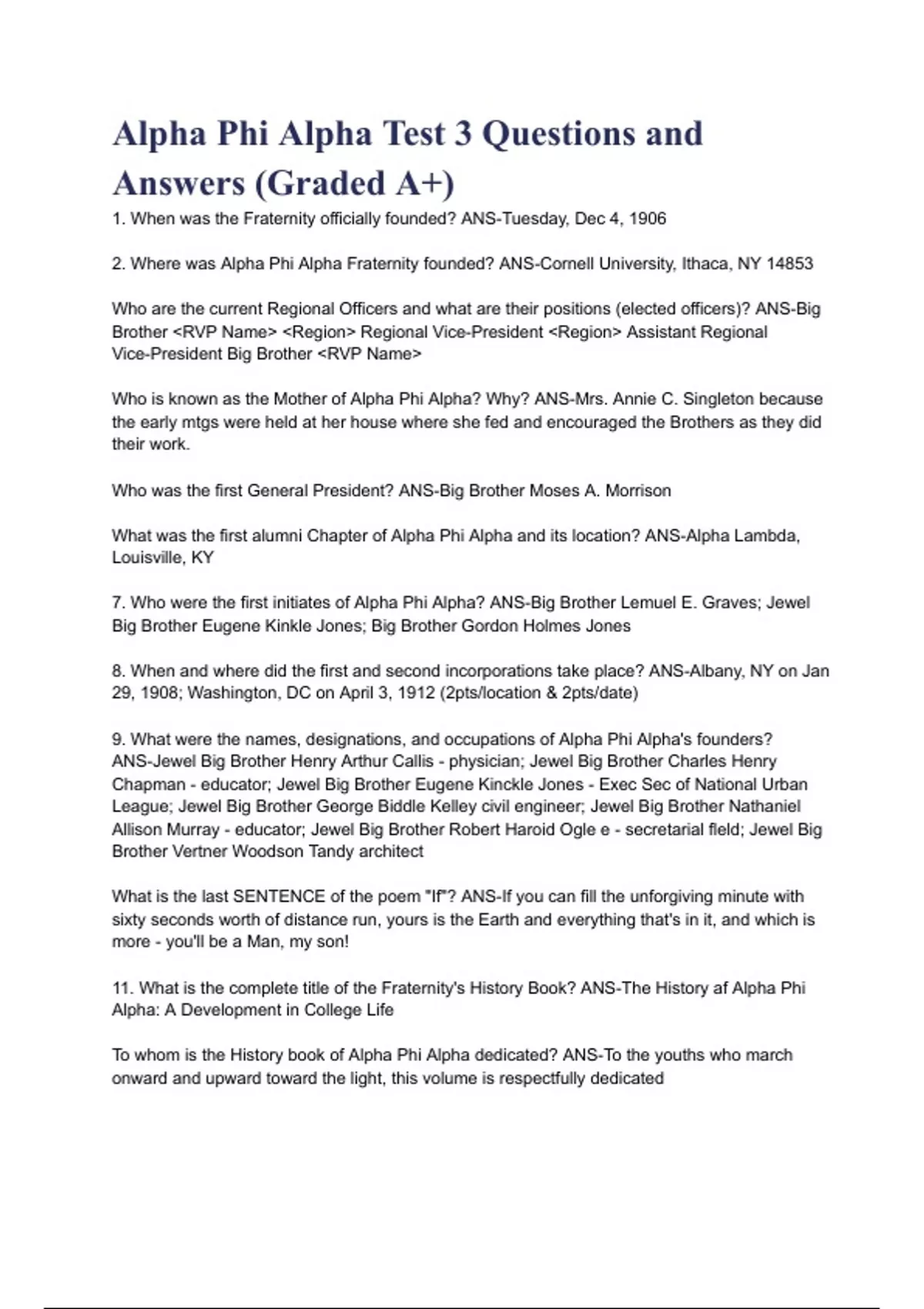 Alpha Phi Alpha Test 3 Questions and Answers (Graded A+) 1. When was the Fraternity officially founded? ANS-Tuesday, Dec 4, 1906 2. Where was Alpha Phi Alpha Fraternity founded? ANS-Cornell University, Ithaca, NY 14853 Who are the current Regional Officers and what are their positions (elected officers)? ANS-Big Brother RVP Name Region Regional Vice-President Region Assistant Regional Vice-President Big Brother RVP Name Who is known as the Mother of Alpha Phi Alpha? Why? ANS-Mrs. Annie C. Singleton because the early mtgs were held at her house where she fed and encouraged the Brothers as they did their work. Who was the first General President? ANS-Big Brother Moses A. Morrison What was the first alumni Chapter of Alpha Phi Alpha and its location? ANS-Alpha Lambda, Louisville, KY 7. Who were the first initiates of Alpha Phi Alpha? ANS-Big Brother Lemuel E. Graves; Jewel Big Brother Eugene Kinkle Jones; Big Brother Gordon Holmes Jones 8. When and where did the first and second incorporations take place? ANS-Albany, NY on Jan 29, 1908; Washington, DC on April 3, 1912 (2pts/location & 2pts/date) 9. What were the names, designations, and occupations of Alpha Phi Alpha's founders? ANS-Jewel Big Brother Henry Arthur Callis - physician; Jewel Big Brother Charles Henry Chapman - educator; Jewel Big Brother Eugene Kinckle Jones - Exec Sec of National Urban League; Jewel Big Brother George Biddle Kelley civil engineer; Jewel Big Brother Nathaniel Allison Murray - educator; Jewel Big Brother Robert Haroid Ogle e - secretarial fleld; Jewel Big Brother Vertner Woodson Tandy architect What is the last SENTENCE of the poem "If"? ANS-If you can fill the unforgiving minute with sixty seconds worth of distance run, yours is the Earth and everything that's in it, and which is more - you'll be a Man, my son! 11. What is the complete title of the Fraternity's History Book? ANS-The History af Alpha Phi Alpha: A Development in College Life To whom is the History book of Alpha Phi Alpha dedicated? ANS-To the youths who march onward and upward toward the light, this volume is respectfully dedicated 13. What are the titles of the first seven chapters of the History Book? ANS-Chapter 1- The Origin of Alpha Phi Alpha; Chapter 2 - The Period of Consolidation; Chapter 3 - The First Steps in Expansion; Chapter 4 LOCAI and Natlonal Strivings; Chaprer 5 - Permanent Foundarions; Chanter 6 - Fxnansion and Internal Development; Chapter 7- The Leaven of Self-Examination Who proposed the name of the Fralernity? ANS-Jewel Big Brother Georye B. Kelley thouytı he glves credit to Jewel Big Brother Henry A. Callis (acceptabie if he only puts Kelley's name) Where was the first initiation banquet held? ANS-Masonic Hall (accept Redman's Hall or Odd Fellows' Hall) List seven items from the menu of the first initiation banquet. ANS-Cream Tomato Soup: Salted Wafers Bróiled Lamb Chops; Hashed Brown Potatoes; Finger Rolls; Peas In Tubs; Wild Apple Jelly: Shrimp Salad: Rolled Bread; Olives; Pickles; Neapolitan Ice Cream; Lady Fingers; Chocolate Cake; Demi-tasse; Crackers; Cheese; Alpha Phi Alpha Punch; Brotherhood Smoke Why did C.C. Poindexter resign from the Alpha Phi Alpha Society? ANS-He expressed the idea that the Negro in America had no cultural background upon which to build a framework of a college fraternity and that this should be a work for a later period Who was the first Editor-In-Chief of the Sphinx? ANS-Big Brother Raymond W. Cannon Write the Greek Alphabet and their symbols. ANS-A- Alpha; B- Beta; r- Gamma; A- Delta; E- Epsilon; Z-- Zeta; H- Eta; e- Theta I- lota; K- Kappa; A-Lambda; M- Mu; N- Nu; E- Xi; O- Omicron; n - P P-Rho; E- Sigma; T-Tau;Y-Upsilon; O-Phi; X - Chi; Y- Psi; 2- Omega 20. Who is the present General President of Alpha Phi Alpha Fraternity, Inc.? ANS-Big Bro Willis L. Lonzer III 21. Where was the first General Convention of Alpha Phi Alpha held? ANS-Beta Chapter, Howard University, Washington, DC.; Fourth Floor of the Main Bldg in the room of the former Howard Journal