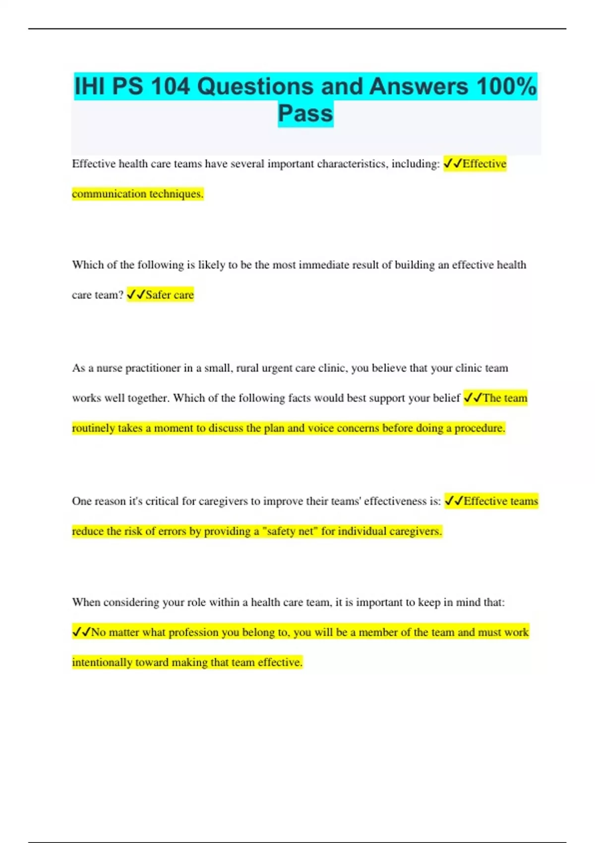 Effective health care teams have several important characteristics, including: Effective communication techniques. Which of the following is likely to be the most immediate result of building an effective health care team? Safer care As a nurse practitioner in a small, rural urgent care clinic, you believe that your clinic team works well together. Which of the following facts would best support your belief The team routinely takes a moment to discuss the plan and voice concerns before doing a procedure.