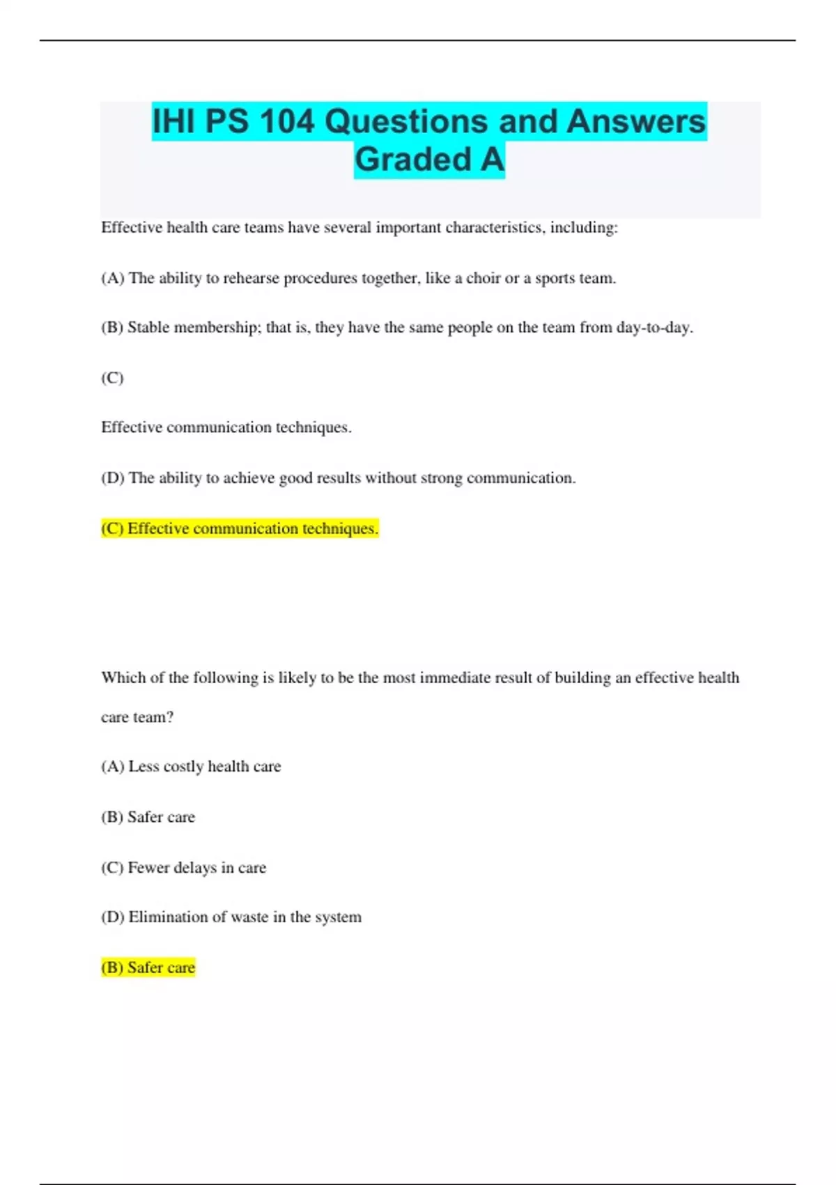 IHI PS 104 Questions and Answers Graded A+