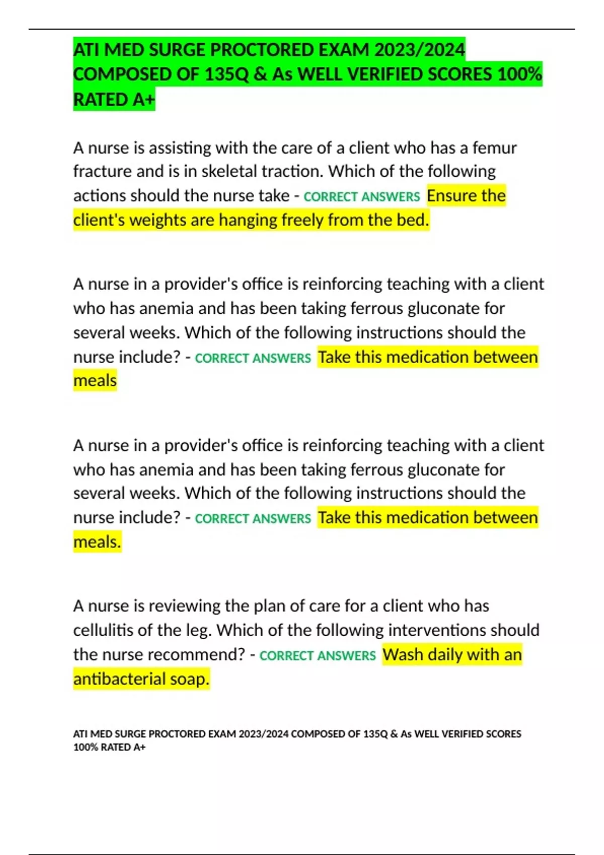 ATI MED SURGE PROCTORED EXAM 2023/2024 COMPOSED OF 135Q & As WELL VERIFIED SCORES 100% RATED A+
