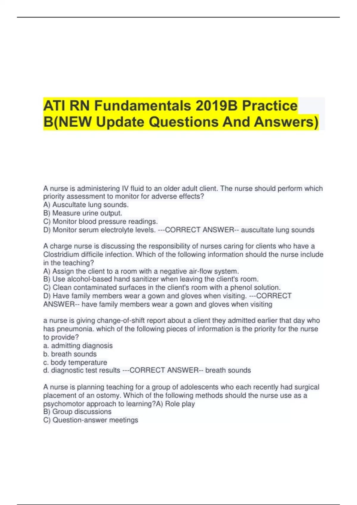 ATI RN Fundamentals 2019B Practice B(NEW Update Questions And Answers) A nurse is administering IV fluid to an older adult client. The nurse should perform which priority assessment to monitor for adverse effects? A) Auscultate lung sounds. B) Measure urine output. C) Monitor blood pressure readings. D) Monitor serum electrolyte levels. ---CORRECT ANSWER-- auscultate lung sounds A charge nurse is discussing the responsibility of nurses caring for clients who have a Clostridium difficile infection. Which of the following information should the nurse include in the teaching? A) Assign the client to a room with a negative air-flow system. B) Use alcohol-based hand sanitizer when leaving the client's room. C) Clean contaminated surfaces in the client's room with a phenol solution. D) Have family members wear a gown and gloves when visiting. ---CORRECT ANSWER-- have family members wear a gown and gloves when visiting a nurse is giving change-of-shift report about a client they admitted earlier that day who has pneumonia. which of the following pieces of information is the priority for the nurse